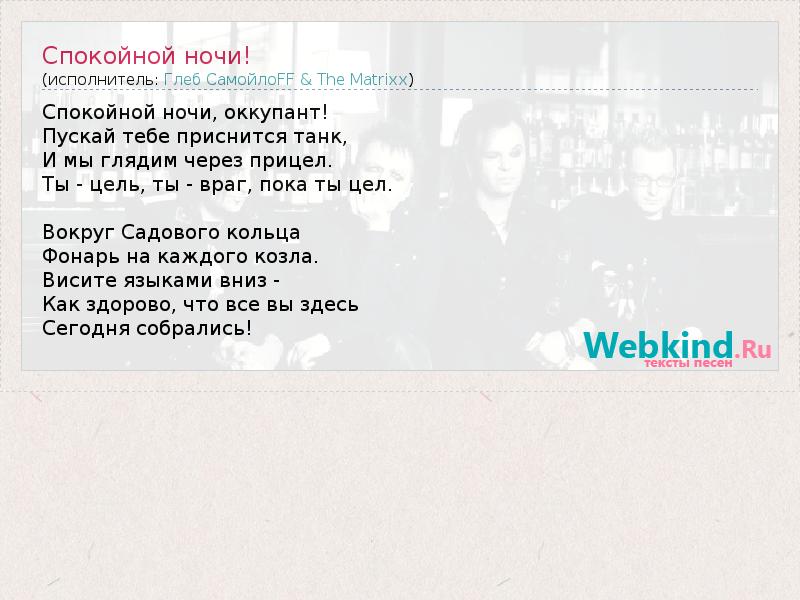 Спокойной ночи, оккупант! Пускай тебе приснится танк, И мы глядим через прицел. Ты - цель, ты - враг, пока ты цел. Вокруг Садового кольца Фонарь на каждого козла. Висите языками вниз - Как здорово, что все вы здесь Сегодня собрались!