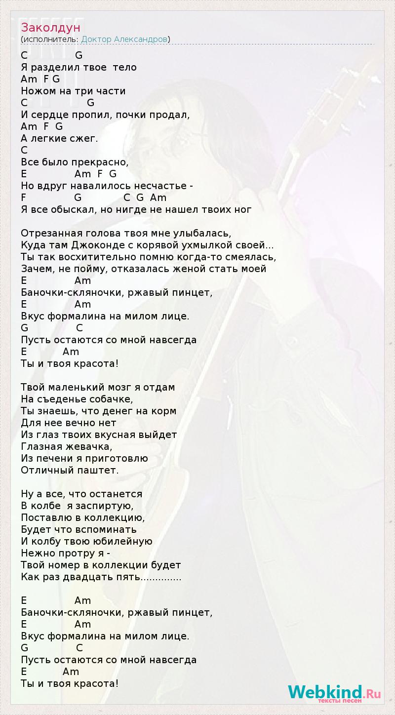 C G Я разделил твое тело Am F G Ножом на три части C G И сердце пропил, почки продал, Am F G А легкие сжег. C Все было прекрасно, E Am F G Но вдруг навалилось несчастье - F G C G Am Я все обыскал, но нигде не нашел твоих ног Отрезанная голова твоя мне улыбалась, Куда там Джоконде с корявой ухмылкой своей... Ты так восхитительно помню когда-то смеялась, Зачем, не пойму, отказалась женой стать моей E Am Баночки-скляночки, ржавый пинцет, E Am Вкус формалина на милом лице. G C Пусть остаются со мной навсегда E Am Ты и твоя красота! Твой маленький мозг я отдам На съеденье собачке, Ты знаешь, что денег на корм Для нее вечно нет Из глаз твоих вкусная выйдет Глазная жевачка, Из печени я приготовлю Отличный паштет. Ну а все, что останется В колбе я заспиртую, Поставлю в коллекцию, Будет что вспоминать И колбу твою юбилейную Нежно протру я - Твой номер в коллекции будет Как раз двадцать пять.............. E Am Баночки-скляночки, ржавый пинцет, E Am Вкус формалина на милом лице. G C Пусть остаются со мной навсегда E Am Ты и твоя красота!