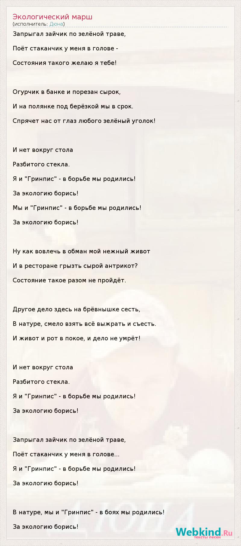 Запрыгал зайчик по зелёной траве, Поёт стаканчик у меня в голове - Состояния такого желаю я тебе! Огурчик в банке и порезан сырок, И на полянке под берёзкой мы в срок. Спрячет нас от глаз любого зелёный уголок! И нет вокруг стола Разбитого стекла. Я и "Гринпис" - в борьбе мы родились! За экологию борись! Мы и "Гринпис" - в борьбе мы родились! За экологию борись! Ну как вовлечь в обман мой нежный живот И в ресторане грызть сырой антрикот? Состояние такое разом не пройдёт. Другое дело здесь на брёвнышке сесть, В натуре, смело взять всё выжрать и съесть. И живот и рот в покое, и дело не умрёт! И нет вокруг стола Разбитого стекла. Я и "Гринпис" - в борьбе мы родились! За экологию борись! Запрыгал зайчик по зелёной траве, Поёт стаканчик у меня в голове... Я и "Гринпис" - в борьбе мы родились! За экологию борись! В натуре, мы и "Гринпис" - в боях мы родились! За экологию борись!