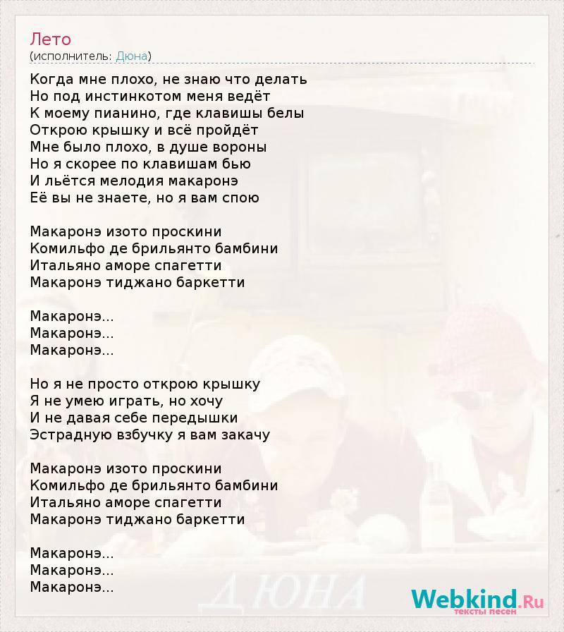 Когда мне плохо, не знаю что делать Но под инстинкотом меня ведёт К моему пианино, где клавишы белы Открою крышку и всё пройдёт Мне было плохо, в душе вороны Но я скорее по клавишам бью И льётся мелодия макаронэ Её вы не знаете, но я вам спою Макаронэ изото проскини Комильфо де брильянто бамбини Итальяно аморе спагетти Макаронэ тиджано баркетти Макаронэ... Макаронэ... Макаронэ... Но я не просто открою крышку Я не умею играть, но хочу И не давая себе передышки Эстрадную взбучку я вам закачу Макаронэ изото проскини Комильфо де брильянто бамбини Итальяно аморе спагетти Макаронэ тиджано баркетти Макаронэ... Макаронэ... Макаронэ...