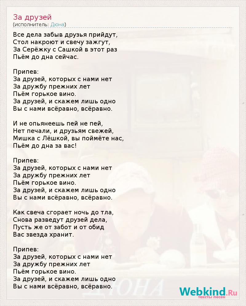 Все дела забыв друзья прийдут, Стол накроют и свечу зажгут, За Серёжку с Сашкой в этот раз Пьём до дна сейчас. Припев: За друзей, которых с нами нет За дружбу прежних лет Пьём горькое вино. За друзей, и скажем лишь одно Вы с нами всёравно, всёравно. И не опьянеешь пей не пей, Hет печали, и друзьям свежей, Мишка с Лёшкой, вы поймёте нас, Пьём до дна за вас! Припев: За друзей, которых с нами нет За дружбу прежних лет Пьём горькое вино. За друзей, и скажем лишь одно Вы с нами всёравно, всёравно. Как свеча сгорает ночь до тла, Снова разведут друзей дела, Пусть же от забот и от обид Вас звезда хранит. Припев: За друзей, которых с нами нет За дружбу прежних лет Пьём горькое вино. За друзей, и скажем лишь одно Вы с нами всёравно, всёравно.