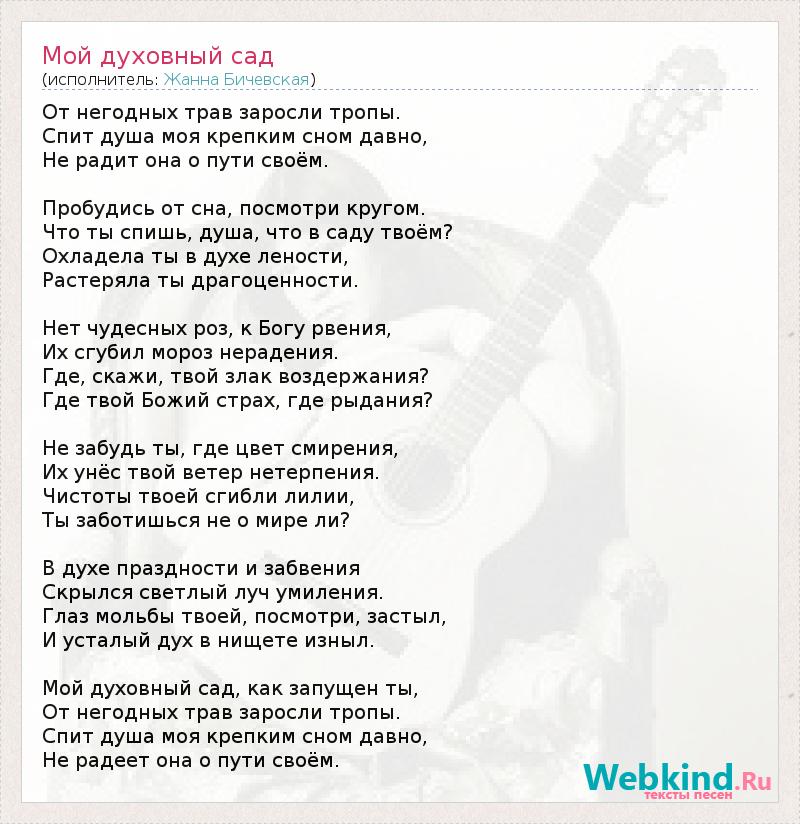 От негодных трав заросли тропы. Спит душа моя крепким сном давно, Не радит она о пути своём. Пробудись от сна, посмотри кругом. Что ты спишь, душа, что в саду твоём? Охладела ты в духе лености, Растеряла ты драгоценности. Нет чудесных роз, к Богу рвения, Их сгубил мороз нерадения. Где, скажи, твой злак воздержания? Где твой Божий страх, где рыдания? Не забудь ты, где цвет смирения, Их унёс твой ветер нетерпения. Чистоты твоей сгибли лилии, Ты заботишься не о мире ли? В духе праздности и забвения Скрылся светлый луч умиления. Глаз мольбы твоей, посмотри, застыл, И усталый дух в нищете изныл. Мой духовный сад, как запущен ты, От негодных трав заросли тропы. Спит душа моя крепким сном давно, Не радеет она о пути своём.