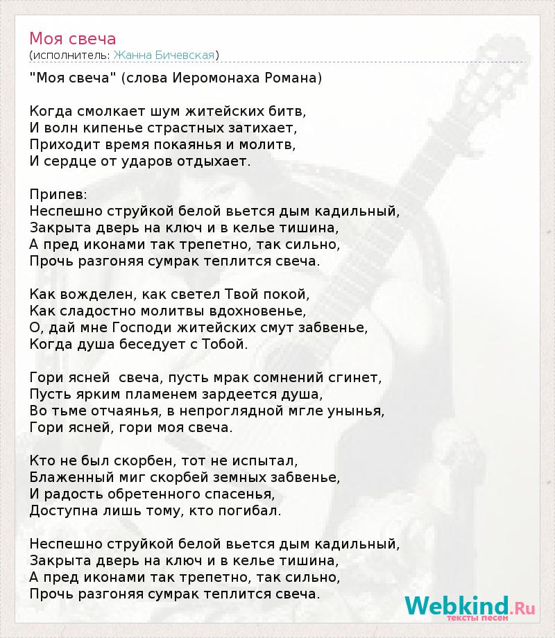 "Моя свеча" (слова Иеромонаха Романа) Когда смолкает шум житейских битв, И волн кипенье страстных затихает, Приходит время покаянья и молитв, И сердце от ударов отдыхает. Припев: Неспешно струйкой белой вьется дым кадильный, Закрыта дверь на ключ и в келье тишина, А пред иконами так трепетно, так сильно, Прочь разгоняя сумрак теплится свеча. Как вожделен, как светел Твой покой, Как сладостно молитвы вдохновенье, О, дай мне Господи житейских смут забвенье, Когда душа беседует с Тобой. Гори ясней свеча, пусть мрак сомнений сгинет, Пусть ярким пламенем зардеется душа, Во тьме отчаянья, в непроглядной мгле унынья, Гори ясней, гори моя свеча. Кто не был скорбен, тот не испытал, Блаженный миг скорбей земных забвенье, И радость обретенного спасенья, Доступна лишь тому, кто погибал. Неспешно струйкой белой вьется дым кадильный, Закрыта дверь на ключ и в келье тишина, А пред иконами так трепетно, так сильно, Прочь разгоняя сумрак теплится свеча.