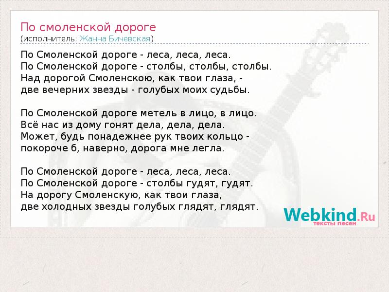 По Смоленской дороге - леса, леса, леса. По Смоленской дороге - столбы, столбы, столбы. Над дорогой Смоленскою, как твои глаза, - две вечерних звезды - голубых моих судьбы. По Смоленской дороге метель в лицо, в лицо. Всё нас из дому гонят дела, дела, дела. Может, будь понадежнее рук твоих кольцо - покороче б, наверно, дорога мне легла. По Смоленской дороге - леса, леса, леса. По Смоленской дороге - столбы гудят, гудят. На дорогу Смоленскую, как твои глаза, две холодных звезды голубых глядят, глядят.