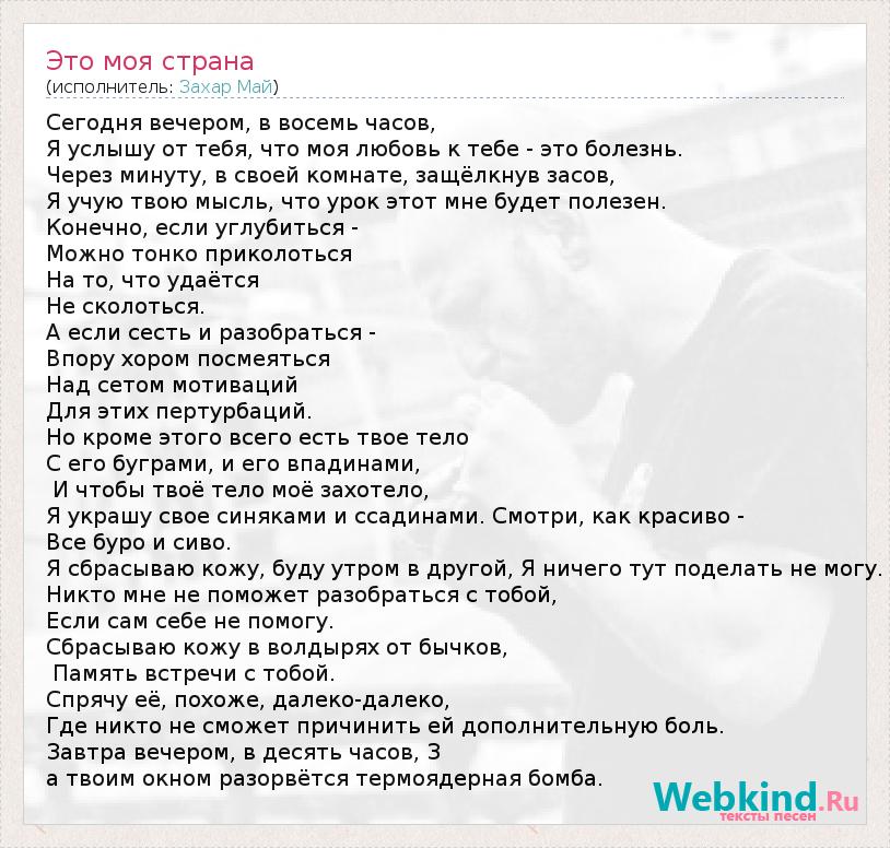 Сегодня вечером, в восемь часов, Я услышу от тебя, что моя любовь к тебе - это болезнь. Через минуту, в своей комнате, защёлкнув засов, Я учую твою мысль, что урок этот мне будет полезен. Конечно, если углубиться - Можно тонко приколоться На то, что удаётся Не сколоться. А если сесть и разобраться - Впору хором посмеяться Над сетом мотиваций Для этих пертурбаций. Но кроме этого всего есть твое тело С его буграми, и его впадинами, И чтобы твоё тело моё захотело, Я украшу свое синяками и ссадинами. Смотри, как красиво - Все буро и сиво. Я сбрасываю кожу, буду утром в другой, Я ничего тут поделать не могу. Никто мне не поможет разобраться с тобой, Если сам себе не помогу. Сбрасываю кожу в волдырях от бычков, Память встречи с тобой. Спрячу её, похоже, далеко-далеко, Где никто не сможет причинить ей дополнительную боль. Завтра вечером, в десять часов, З а твоим окном разорвётся термоядерная бомба.