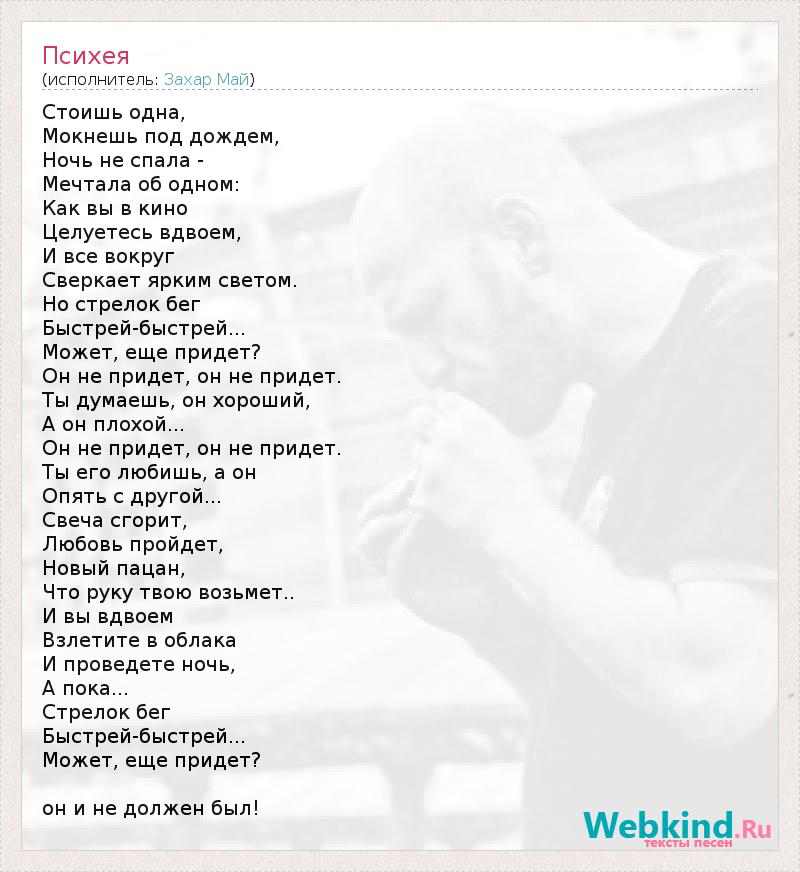 Стоишь одна, Мокнешь под дождем, Ночь не спала - Мечтала об одном: Как вы в кино Целуетесь вдвоем, И все вокруг Сверкает ярким светом. Но стрелок бег Быстрей-быстрей... Может, еще придет? Он не придет, он не придет. Ты думаешь, он хороший, А он плохой... Он не придет, он не придет. Ты его любишь, а он Опять с другой... Свеча сгорит, Любовь пройдет, Новый пацан, Что руку твою возьмет.. И вы вдвоем Взлетите в облака И проведете ночь, А пока... Стрелок бег Быстрей-быстрей... Может, еще придет? он и не должен был!