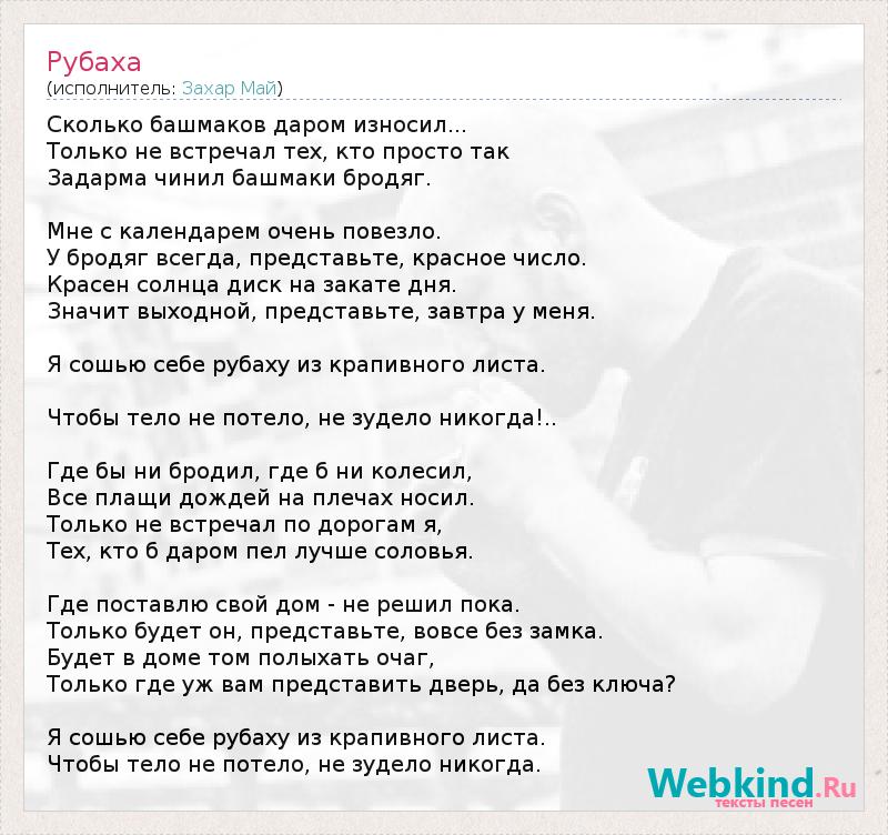 Сколько башмаков даром износил... Только не встречал тех, кто просто так Задарма чинил башмаки бродяг. Мне с календарем очень повезло. У бродяг всегда, представьте, красное число. Красен солнца диск на закате дня. Значит выходной, представьте, завтра у меня. Я сошью себе рубаху из крапивного листа. Чтобы тело не потело, не зудело никогда!.. Где бы ни бродил, где б ни колесил, Все плащи дождей на плечах носил. Только не встречал по дорогам я, Тех, кто б даром пел лучше соловья. Где поставлю свой дом - не решил пока. Только будет он, представьте, вовсе без замка. Будет в доме том полыхать очаг, Только где уж вам представить дверь, да без ключа? Я сошью себе рубаху из крапивного листа. Чтобы тело не потело, не зудело никогда.