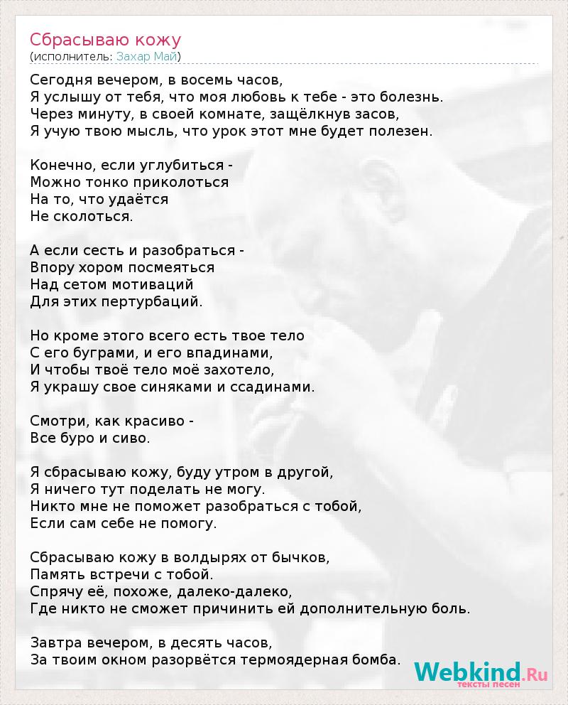 Сегодня вечером, в восемь часов, Я услышу от тебя, что моя любовь к тебе - это болезнь. Через минуту, в своей комнате, защёлкнув засов, Я учую твою мысль, что урок этот мне будет полезен. Конечно, если углубиться - Можно тонко приколоться На то, что удаётся Не сколоться. А если сесть и разобраться - Впору хором посмеяться Над сетом мотиваций Для этих пертурбаций. Но кроме этого всего есть твое тело С его буграми, и его впадинами, И чтобы твоё тело моё захотело, Я украшу свое синяками и ссадинами. Смотри, как красиво - Все буро и сиво. Я сбрасываю кожу, буду утром в другой, Я ничего тут поделать не могу. Никто мне не поможет разобраться с тобой, Если сам себе не помогу. Сбрасываю кожу в волдырях от бычков, Память встречи с тобой. Спрячу её, похоже, далеко-далеко, Где никто не сможет причинить ей дополнительную боль. Завтра вечером, в десять часов, За твоим окном разорвётся термоядерная бомба.