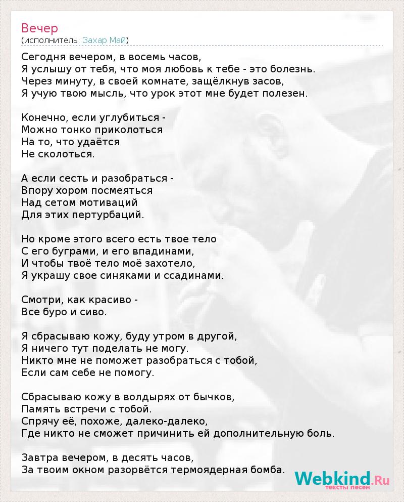 Сегодня вечером, в восемь часов, Я услышу от тебя, что моя любовь к тебе - это болезнь. Через минуту, в своей комнате, защёлкнув засов, Я учую твою мысль, что урок этот мне будет полезен. Конечно, если углубиться - Можно тонко приколоться На то, что удаётся Не сколоться. А если сесть и разобраться - Впору хором посмеяться Над сетом мотиваций Для этих пертурбаций. Но кроме этого всего есть твое тело С его буграми, и его впадинами, И чтобы твоё тело моё захотело, Я украшу свое синяками и ссадинами. Смотри, как красиво - Все буро и сиво. Я сбрасываю кожу, буду утром в другой, Я ничего тут поделать не могу. Никто мне не поможет разобраться с тобой, Если сам себе не помогу. Сбрасываю кожу в волдырях от бычков, Память встречи с тобой. Спрячу её, похоже, далеко-далеко, Где никто не сможет причинить ей дополнительную боль. Завтра вечером, в десять часов, За твоим окном разорвётся термоядерная бомба.