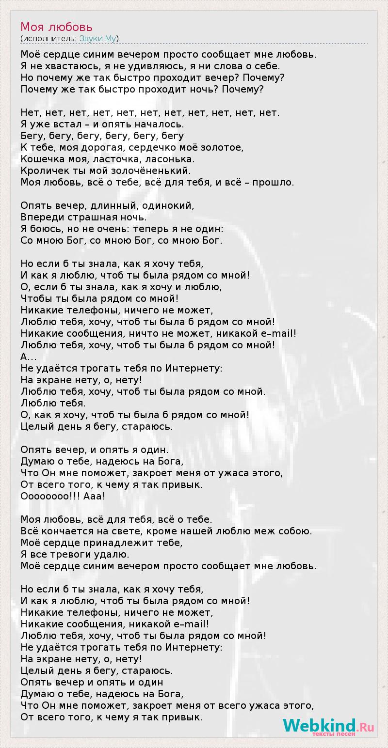 Моё сердце синим вечером просто сообщает мне любовь. Я не хвастаюсь, я не удивляюсь, я ни слова о себе. Но почему же так быстро проходит вечер? Почему? Почему же так быстро проходит ночь? Почему? Нет, нет, нет, нет, нет, нет, нет, нет, нет, нет, нет. Я уже встал – и опять началось. Бегу, бегу, бегу, бегу, бегу, бегу К тебе, моя дорогая, сердечко моё золотое, Кошечка моя, ласточка, ласонька. Кроличек ты мой золочёненький. Моя любовь, всё о тебе, всё для тебя, и всё – прошло. Опять вечер, длинный, одинокий, Впереди страшная ночь. Я боюсь, но не очень: теперь я не один: Со мною Бог, со мною Бог, со мною Бог. Но если б ты знала, как я хочу тебя, И как я люблю, чтоб ты была рядом со мной! О, если б ты знала, как я хочу и люблю, Чтобы ты была рядом со мной! Никакие телефоны, ничего не может, Люблю тебя, хочу, чтоб ты была б рядом со мной! Никакие сообщения, ничто не может, никакой e–mail! Люблю тебя, хочу, чтоб ты была б рядом со мной! А… Не удаётся трогать тебя по Интернету: На экране нету, о, нету! Люблю тебя, хочу, чтоб ты была рядом со мной. Люблю тебя. О, как я хочу, чтоб ты была б рядом со мной! Целый день я бегу, стараюсь. Опять вечер, и опять я один. Думаю о тебе, надеюсь на Бога, Что Он мне поможет, закроет меня от ужаса этого, От всего того, к чему я так привык. Оооооооо!!! Ааа! Моя любовь, всё для тебя, всё о тебе. Всё кончается на свете, кроме нашей люблю меж собою. Моё сердце принадлежит тебе, Я все тревоги удалю. Моё сердце синим вечером просто сообщает мне любовь. Но если б ты знала, как я хочу тебя, И как я люблю, чтоб ты была рядом со мной! Никакие телефоны, ничего не может, Никакие сообщения, никакой e–mail! Люблю тебя, хочу, чтоб ты была рядом со мной! Не удаётся трогать тебя по Интернету: На экране нету, о, нету! Целый день я бегу, стараюсь. Опять вечер и опять и один Думаю о тебе, надеюсь на Бога, Что Он мне поможет, закроет меня от всего ужаса этого, От всего того, к чему я так привык.