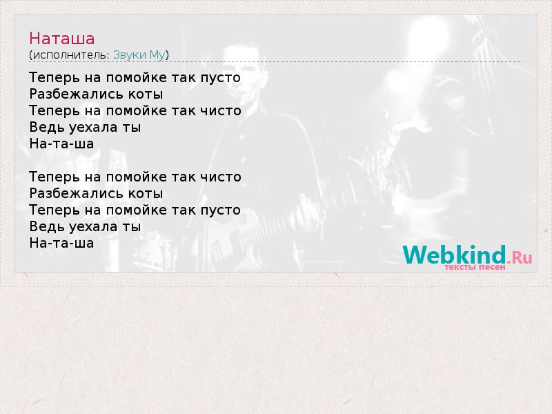 Теперь на помойке так пусто Разбежались коты Теперь на помойке так чисто Ведь уехала ты На-та-ша Теперь на помойке так чисто Разбежались коты Теперь на помойке так пусто Ведь уехала ты На-та-ша