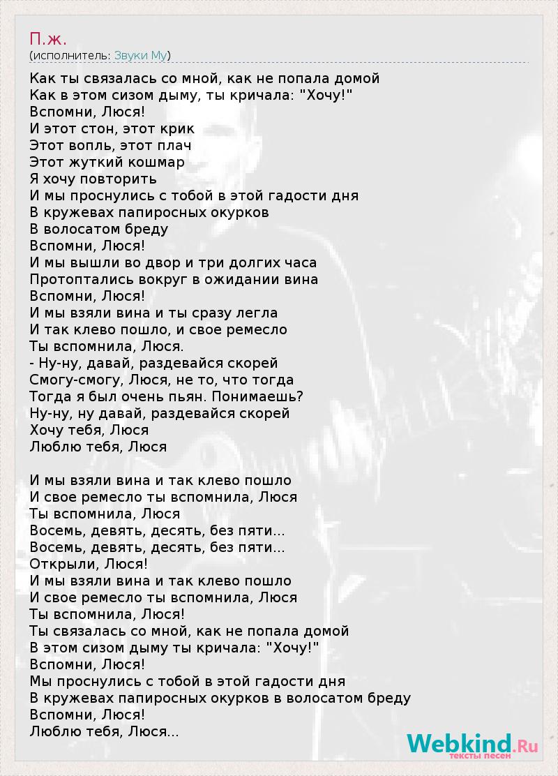 Как ты связалась со мной, как не попала домой Как в этом сизом дыму, ты кричала: "Хочу!" Вспомни, Люся! И этот стон, этот крик Этот вопль, этот плач Этот жуткий кошмар Я хочу повторить И мы проснулись с тобой в этой гадости дня В кружевах папиросных окурков В волосатом бреду Вспомни, Люся! И мы вышли во двор и три долгих часа Протоптались вокруг в ожидании вина Вспомни, Люся! И мы взяли вина и ты сразу легла И так клево пошло, и свое ремесло Ты вспомнила, Люся. - Ну-ну, давай, раздевайся скорей Смогу-смогу, Люся, не то, что тогда Тогда я был очень пьян. Понимаешь? Ну-ну, ну давай, раздевайся скорей Хочу тебя, Люся Люблю тебя, Люся И мы взяли вина и так клево пошло И свое ремесло ты вспомнила, Люся Ты вспомнила, Люся Восемь, девять, десять, без пяти... Восемь, девять, десять, без пяти... Открыли, Люся! И мы взяли вина и так клево пошло И свое ремесло ты вспомнила, Люся Ты вспомнила, Люся! Ты связалась со мной, как не попала домой В этом сизом дыму ты кричала: "Хочу!" Вспомни, Люся! Мы проснулись с тобой в этой гадости дня В кружевах папиросных окурков в волосатом бреду Вспомни, Люся! Люблю тебя, Люся...