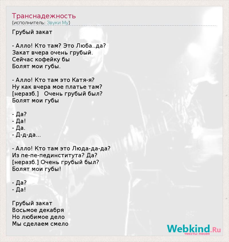 Грубый закат - Алло! Кто там? Это Люба..да? Закат вчера очень грубый. Сейчас кофейку бы Болят мои губы. - Алло! Кто там это Катя-я? Ну как вчера мое платье там? [неразб.] Очень грубый был? Болят мои губы - Да? - Да! - Да. - Д-д-да... - Алло! Кто там это Люда-да-да? Из пе-пе-пединститута? Да? [неразб.] Очень грубый был? Болят мои губы! - Да? - Да! Грубый закат Восьмое декабря Но любимое дело Мы сделаем смело