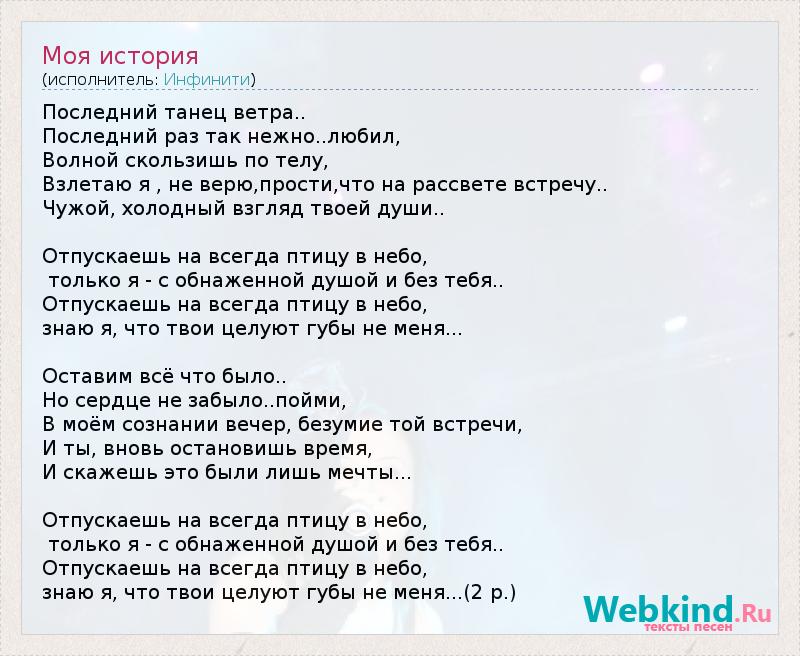 Последний танец ветра.. Последний раз так нежно..любил, Волной скользишь по телу, Взлетаю я , не верю,прости,что на рассвете встречу.. Чужой, холодный взгляд твоей души.. Отпускаешь на всегда птицу в небо, только я - с обнаженной душой и без тебя.. Отпускаешь на всегда птицу в небо, знаю я, что твои целуют губы не меня... Оставим всё что было.. Но сердце не забыло..пойми, В моём сознании вечер, безумие той встречи, И ты, вновь остановишь время, И скажешь это были лишь мечты... Отпускаешь на всегда птицу в небо, только я - с обнаженной душой и без тебя.. Отпускаешь на всегда птицу в небо, знаю я, что твои целуют губы не меня...(2 р.)