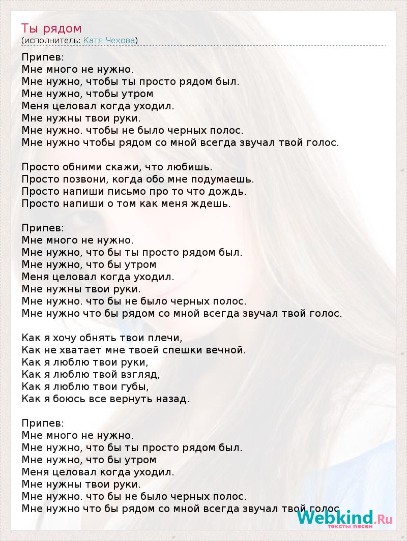 Припев: Мне много не нужно. Мне нужно, чтобы ты просто рядом был. Мне нужно, чтобы утром Меня целовал когда уходил. Мне нужны твои руки. Мне нужно. чтобы не было черных полос. Мне нужно чтобы рядом со мной всегда звучал твой голос. Просто обними скажи, что любишь. Просто позвони, когда обо мне подумаешь. Просто напиши письмо про то что дождь. Просто напиши о том как меня ждешь. Припев: Мне много не нужно. Мне нужно, что бы ты просто рядом был. Мне нужно, что бы утром Меня целовал когда уходил. Мне нужны твои руки. Мне нужно. что бы не было черных полос. Мне нужно что бы рядом со мной всегда звучал твой голос. Как я хочу обнять твои плечи, Как не хватает мне твоей спешки вечной. Как я люблю твои руки, Как я люблю твой взгляд, Как я люблю твои губы, Как я боюсь все вернуть назад. Припев: Мне много не нужно. Мне нужно, что бы ты просто рядом был. Мне нужно, что бы утром Меня целовал когда уходил. Мне нужны твои руки. Мне нужно. что бы не было черных полос. Мне нужно что бы рядом со мной всегда звучал твой голос