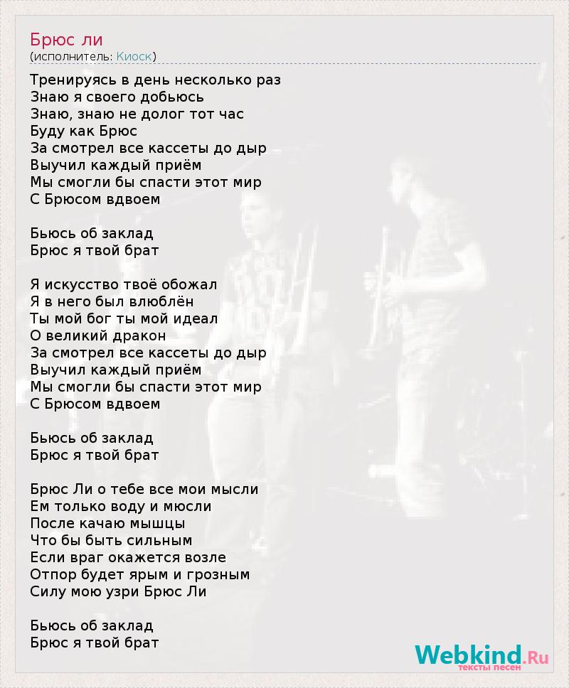 Тренируясь в день несколько раз Знаю я своего добьюсь Знаю, знаю не долог тот час Буду как Брюс За смотрел все кассеты до дыр Выучил каждый приём Мы смогли бы спасти этот мир С Брюсом вдвоем Бьюсь об заклад Брюс я твой брат Я искусство твоё обожал Я в него был влюблён Ты мой бог ты мой идеал О великий дракон За смотрел все кассеты до дыр Выучил каждый приём Мы смогли бы спасти этот мир С Брюсом вдвоем Бьюсь об заклад Брюс я твой брат Брюс Ли о тебе все мои мысли Ем только воду и мюсли После качаю мышцы Что бы быть сильным Если враг окажется возле Отпор будет ярым и грозным Силу мою узри Брюс Ли Бьюсь об заклад Брюс я твой брат