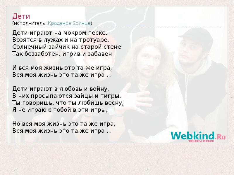 Дети играют на мокром песке, Возятся в лужах и на тротуаре. Солнечный зайчик на старой стене Так беззаботен, игрив и забавен И вся моя жизнь это та же игра, Вся моя жизнь это та же игра ... Дети играют в любовь и войну, В них просыпаются зайцы и тигры. Ты говоришь, что ты любишь весну, Я не играю с тобой в эти игры, Но вся моя жизнь это та же игра, Вся моя жизнь это та же игра ...