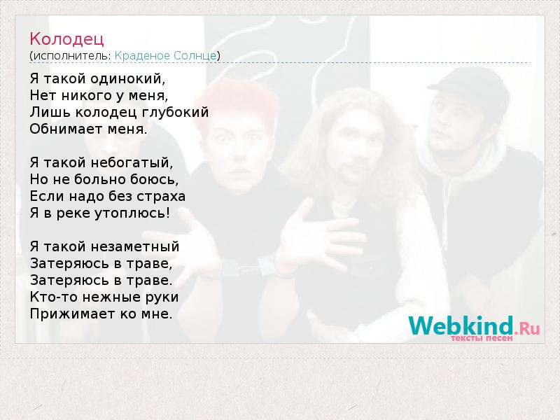 Я такой одинокий, Нет никого у меня, Лишь колодец глубокий Обнимает меня. Я такой небогатый, Но не больно боюсь, Если надо без страха Я в реке утоплюсь! Я такой незаметный Затеряюсь в траве, Затеряюсь в траве. Кто-то нежные руки Прижимает ко мне.