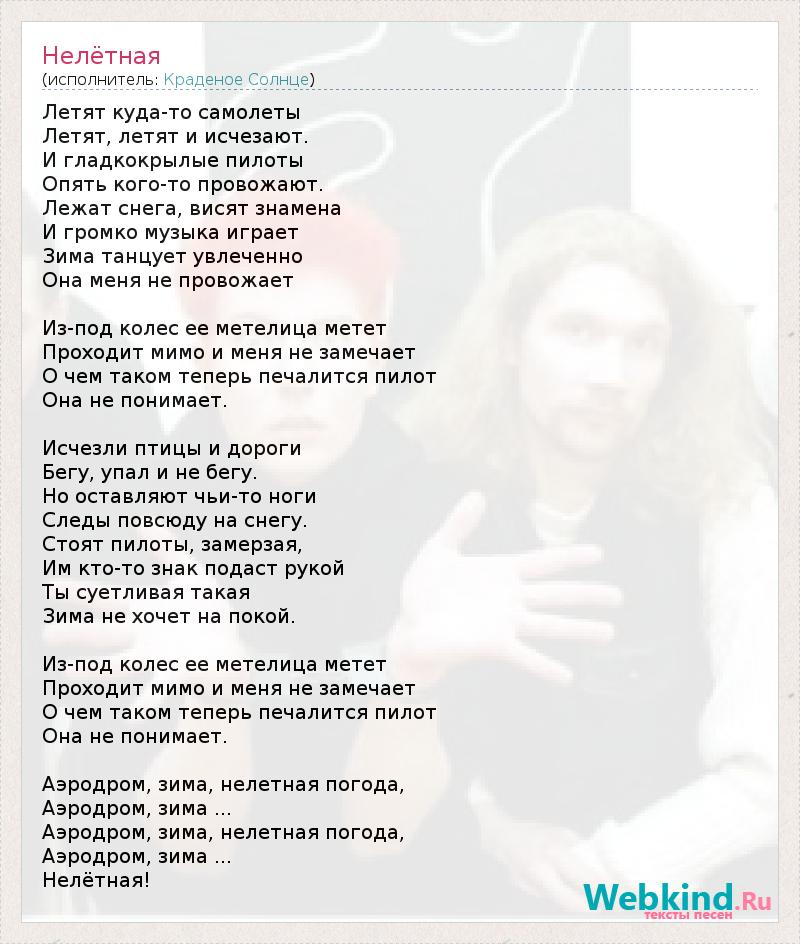 Летят куда-то самолеты Летят, летят и исчезают. И гладкокрылые пилоты Опять кого-то провожают. Лежат снега, висят знамена И громко музыка играет Зима танцует увлеченно Она меня не провожает Из-под колес ее метелица метет Проходит мимо и меня не замечает О чем таком теперь печалится пилот Она не понимает. Исчезли птицы и дороги Бегу, упал и не бегу. Но оставляют чьи-то ноги Следы повсюду на снегу. Стоят пилоты, замерзая, Им кто-то знак подаст рукой Ты суетливая такая Зима не хочет на покой. Из-под колес ее метелица метет Проходит мимо и меня не замечает О чем таком теперь печалится пилот Она не понимает. Аэродром, зима, нелетная погода, Аэродром, зима ... Аэродром, зима, нелетная погода, Аэродром, зима ... Нелётная!