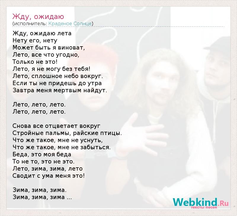 Жду, ожидаю лета Нету его, нету Может быть я виноват, Лето, все что угодно, Только не это! Лето, я не могу без тебя! Лето, сплошное небо вокруг. Если ты не придешь до утра Завтра меня мертвым найдут. Лето, лето, лето. Лето, лето, лето. Снова все отцветает вокруг Стройные пальмы, райские птицы. Что же такое, мне не уснуть, Что же такое, мне не забыться. Беда, это моя беда То не то, это не это. Лето, зима, зима, лето Сводит с ума меня это! Зима, зима, зима. Зима, зима, зимa ...