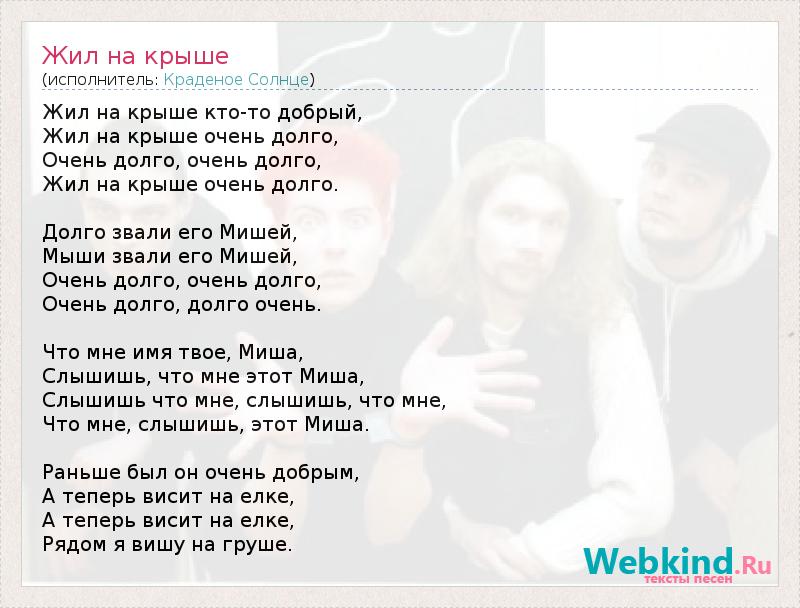 Жил на крыше кто-то добрый, Жил на крыше очень долго, Очень долго, очень долго, Жил на крыше очень долго. Долго звали его Мишей, Мыши звали его Мишей, Очень долго, очень долго, Очень долго, долго очень. Что мне имя твое, Миша, Слышишь, что мне этот Миша, Слышишь что мне, слышишь, что мне, Что мне, слышишь, этот Миша. Раньше был он очень добрым, А теперь висит на елке, А теперь висит на елке, Рядом я вишу на груше.