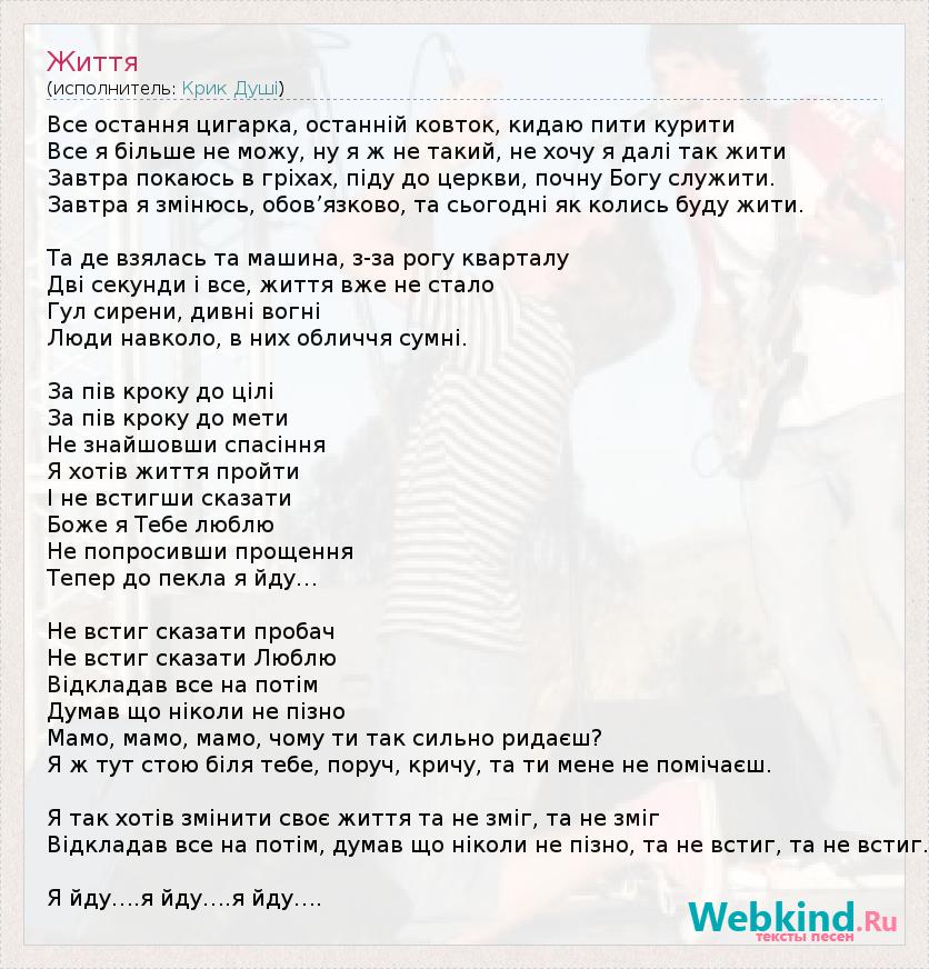 Все остання цигарка, останній ковток, кидаю пити курити Все я більше не можу, ну я ж не такий, не хочу я далі так жити Завтра покаюсь в гріхах, піду до церкви, почну Богу служити. Завтра я змінюсь, обов’язково, та сьогодні як колись буду жити. Та де взялась та машина, з-за рогу кварталу Дві секунди і все, життя вже не стало Гул сирени, дивні вогні Люди навколо, в них обличчя сумні. За пів кроку до цілі За пів кроку до мети Не знайшовши спасіння Я хотів життя пройти І не встигши сказати Боже я Тебе люблю Не попросивши прощення Тепер до пекла я йду… Не встиг сказати пробач Не встиг сказати Люблю Відкладав все на потім Думав що ніколи не пізно Мамо, мамо, мамо, чому ти так сильно ридаєш? Я ж тут стою біля тебе, поруч, кричу, та ти мене не помічаєш. Я так хотів змінити своє життя та не зміг, та не зміг Відкладав все на потім, думав що ніколи не пізно, та не встиг, та не встиг. Я йду….я йду….я йду….