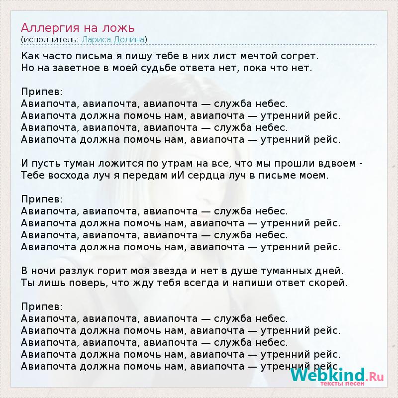 Как часто письма я пишу тебе в них лист мечтой согрет. Но на заветное в моей судьбе ответа нет, пока что нет. Припев: Авиапочта, авиапочта, авиапочта — служба небес. Авиапочта должна помочь нам, авиапочта — утренний рейс. Авиапочта, авиапочта, авиапочта — служба небес. Авиапочта должна помочь нам, авиапочта — утренний рейс. И пусть туман ложится по утрам на все, что мы прошли вдвоем - Тебе восхода луч я передам иИ сердца луч в письме моем. Припев: Авиапочта, авиапочта, авиапочта — служба небес. Авиапочта должна помочь нам, авиапочта — утренний рейс. Авиапочта, авиапочта, авиапочта — служба небес. Авиапочта должна помочь нам, авиапочта — утренний рейс. В ночи разлук горит моя звезда и нет в душе туманных дней. Ты лишь поверь, что жду тебя всегда и напиши ответ скорей. Припев: Авиапочта, авиапочта, авиапочта — служба небес. Авиапочта должна помочь нам, авиапочта — утренний рейс. Авиапочта, авиапочта, авиапочта — служба небес. Авиапочта должна помочь нам, авиапочта — утренний рейс. Авиапочта должна помочь нам, авиапочта — утренний рейс.