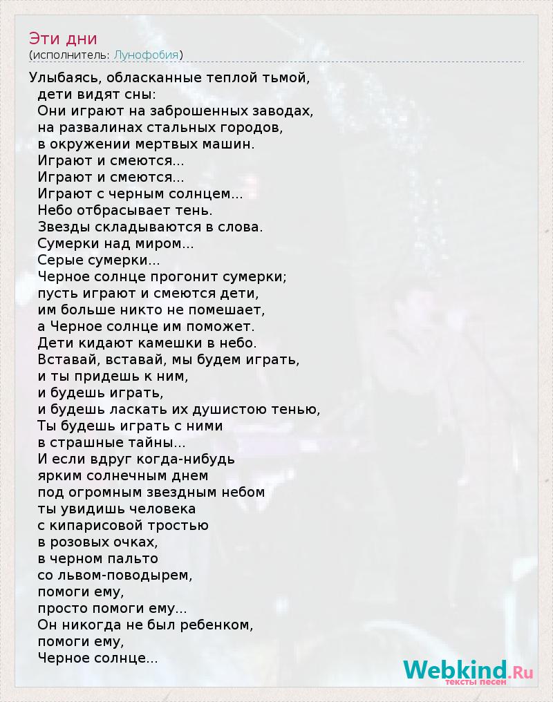 Улыбаясь, обласканные теплой тьмой, дети видят сны: Они играют на заброшенных заводах, на развалинах стальных городов, в окружении мертвых машин. Играют и смеются... Играют и смеются... Играют с черным солнцем... Небо отбрасывает тень. Звезды складываются в слова. Сумерки над миром... Серые сумерки... Черное солнце прогонит сумерки; пусть играют и смеются дети, им больше никто не помешает, а Черное солнце им поможет. Дети кидают камешки в небо. Вставай, вставай, мы будем играть, и ты придешь к ним, и будешь играть, и будешь ласкать их душистою тенью, Ты будешь играть с ними в страшные тайны... И если вдруг когда-нибудь ярким солнечным днем под огромным звездным небом ты увидишь человека с кипарисовой тростью в розовых очках, в черном пальто со львом-поводырем, помоги ему, просто помоги ему... Он никогда не был ребенком, помоги ему, Черное солнце...
