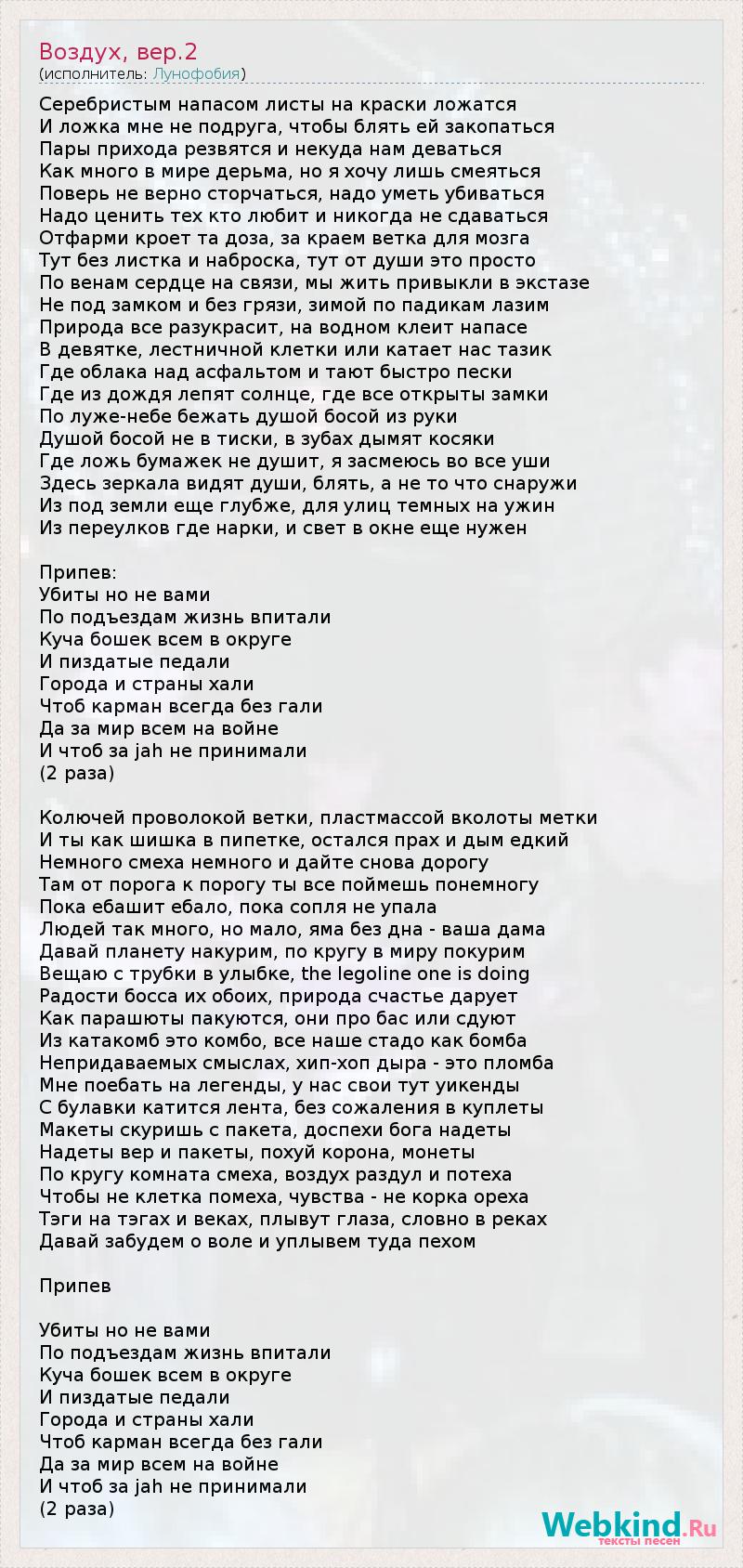 Серебристым напасом листы на краски ложатся И ложка мне не подруга, чтобы блять ей закопаться Пары прихода резвятся и некуда нам деваться Как много в мире дерьма, но я хочу лишь смеяться Поверь не верно сторчаться, надо уметь убиваться Надо ценить тех кто любит и никогда не сдаваться Отфарми кроет та доза, за краем ветка для мозга Тут без листка и наброска, тут от души это просто По венам сердце на связи, мы жить привыкли в экстазе Не под замком и без грязи, зимой по падикам лазим Природа все разукрасит, на водном клеит напасе В девятке, лестничной клетки или катает нас тазик Где облака над асфальтом и тают быстро пески Где из дождя лепят солнце, где все открыты замки По луже-небе бежать душой босой из руки Душой босой не в тиски, в зубах дымят косяки Где ложь бумажек не душит, я засмеюсь во все уши Здесь зеркала видят души, блять, а не то что снаружи Из под земли еще глубже, для улиц темных на ужин Из переулков где нарки, и свет в окне еще нужен Припев: Убиты но не вами По подъездам жизнь впитали Куча бошек всем в округе И пиздатые педали Города и страны хали Чтоб карман всегда без гали Да за мир всем на войне И чтоб за jah не принимали (2 раза) Колючей проволокой ветки, пластмассой вколоты метки И ты как шишка в пипетке, остался прах и дым едкий Немного смеха немного и дайте снова дорогу Там от порога к порогу ты все поймешь понемногу Пока ебашит ебало, пока сопля не упала Людей так много, но мало, яма без дна - ваша дама Давай планету накурим, по кругу в миру покурим Вещаю с трубки в улыбке, the legoline one is doing Радости босса их обоих, природа счастье дарует Как парашюты пакуются, они про бас или сдуют Из катакомб это комбо, все наше стадо как бомба Непридаваемых смыслах, хип-хоп дыра - это пломба Мне поебать на легенды, у нас свои тут уикенды С булавки катится лента, без сожаления в куплеты Макеты скуришь с пакета, доспехи бога надеты Надеты вер и пакеты, похуй корона, монеты По кругу комната смеха, воздух раздул и потеха Чтобы не клетка помеха, чувства - не корка ореха Тэги на тэгах и веках, плывут глаза, словно в реках Давай забудем о воле и уплывем туда пехом Припев Убиты но не вами По подъездам жизнь впитали Куча бошек всем в округе И пиздатые педали Города и страны хали Чтоб карман всегда без гали Да за мир всем на войне И чтоб за jah не принимали (2 раза)