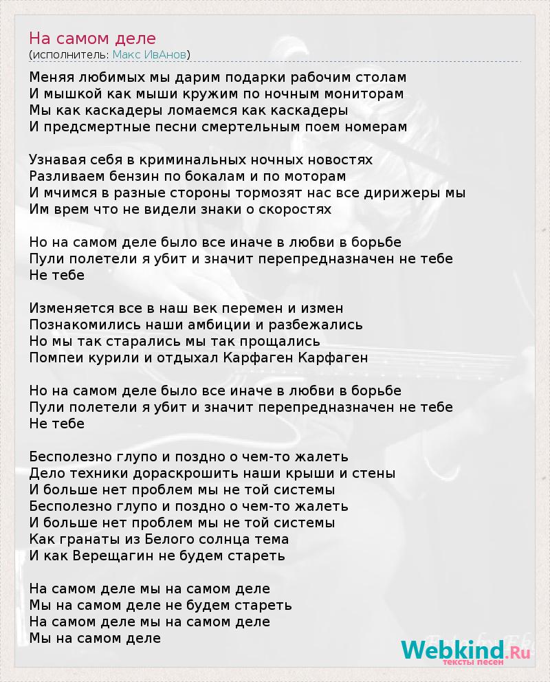 Меняя любимых мы дарим подарки рабочим столам И мышкой как мыши кружим по ночным мониторам Мы как каскадеры ломаемся как каскадеры И предсмертные песни смертельным поем номерам Узнавая себя в криминальных ночных новостях Разливаем бензин по бокалам и по моторам И мчимся в разные стороны тормозят нас все дирижеры мы Им врем что не видели знаки о скоростях Но на самом деле было все иначе в любви в борьбе Пули полетели я убит и значит перепредназначен не тебе Не тебе Изменяется все в наш век перемен и измен Познакомились наши амбиции и разбежались Но мы так старались мы так прощались Помпеи курили и отдыхал Карфаген Карфаген Но на самом деле было все иначе в любви в борьбе Пули полетели я убит и значит перепредназначен не тебе Не тебе Бесполезно глупо и поздно о чем-то жалеть Дело техники дораскрошить наши крыши и стены И больше нет проблем мы не той системы Бесполезно глупо и поздно о чем-то жалеть И больше нет проблем мы не той системы Как гранаты из Белого солнца тема И как Верещагин не будем стареть На самом деле мы на самом деле Мы на самом деле не будем стареть На самом деле мы на самом деле Мы на самом деле
