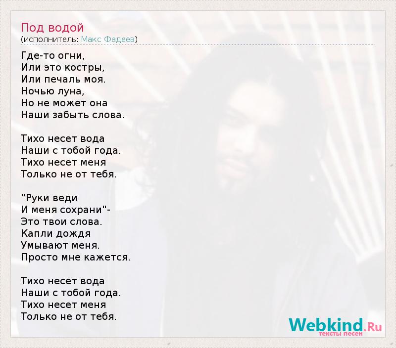 Где-то огни, Или это костры, Или печаль моя. Ночью луна, Но не может она Наши забыть слова. Тихо несет вода Наши с тобой года. Тихо несет меня Только не от тебя. "Руки веди И меня сохрани"- Это твои слова. Капли дождя Умывают меня. Просто мне кажется. Тихо несет вода Наши с тобой года. Тихо несет меня Только не от тебя.