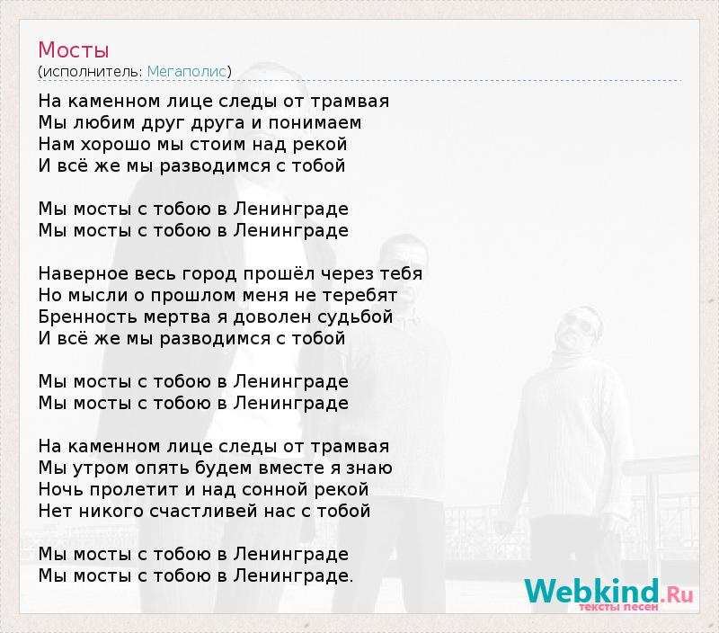 На каменном лице следы от трамвая Мы любим друг друга и понимаем Нам хорошо мы стоим над рекой И всё же мы разводимся с тобой Мы мосты с тобою в Ленинграде Мы мосты с тобою в Ленинграде Наверное весь город прошёл через тебя Но мысли о прошлом меня не теребят Бренность мертва я доволен судьбой И всё же мы разводимся с тобой Мы мосты с тобою в Ленинграде Мы мосты с тобою в Ленинграде На каменном лице следы от трамвая Мы утром опять будем вместе я знаю Ночь пролетит и над сонной рекой Нет никого счастливей нас с тобой Мы мосты с тобою в Ленинграде Мы мосты с тобою в Ленинграде.