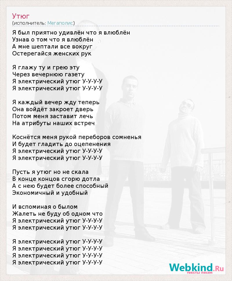 Я был приятно удивлён что я влюблён Узнав о том что я влюблён А мне шептали все вокруг Остерегайся женских рук Я глажу ту и грею эту Через вечернюю газету Я электрический утюг У-У-У-У Я электрический утюг У-У-У-У Я каждый вечер жду теперь Она войдёт закроет дверь Потом меня заставит лечь На атрибуты наших встреч Коснётся меня рукой переборов сомненья И будет гладить до оцепенения Я электрический утюг У-У-У-У Я электрический утюг У-У-У-У Пусть я утюг но не скала В конце концов сгорю дотла А с нею будет более способный Экономичный и удобный И вспоминая о былом Жалеть не буду об одном что Я электрический утюг У-У-У-У Я электрический утюг У-У-У-У Я электрический утюг У-У-У-У Я электрический утюг У-У-У-У Я электрический утюг У-У-У-У Я электрический утюг У-У-У-У