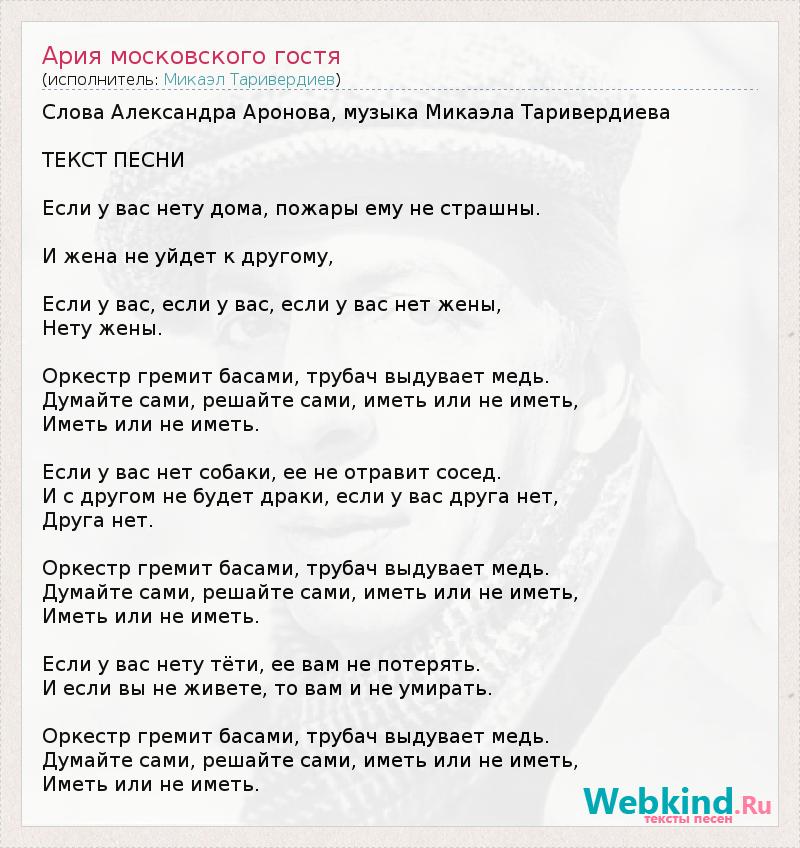 Слова Александра Аронова, музыка Микаэла Таривердиева ТЕКСТ ПЕСНИ Если у вас нету дома, пожары ему не страшны. И жена не уйдет к другому, Если у вас, если у вас, если у вас нет жены, Нету жены. Оркестр гремит басами, трубач выдувает медь. Думайте сами, решайте сами, иметь или не иметь, Иметь или не иметь. Если у вас нет собаки, ее не отравит сосед. И с другом не будет драки, если у вас друга нет, Друга нет. Оркестр гремит басами, трубач выдувает медь. Думайте сами, решайте сами, иметь или не иметь, Иметь или не иметь. Если у вас нету тёти, ее вам не потерять. И если вы не живете, то вам и не умирать. Оркестр гремит басами, трубач выдувает медь. Думайте сами, решайте сами, иметь или не иметь, Иметь или не иметь.