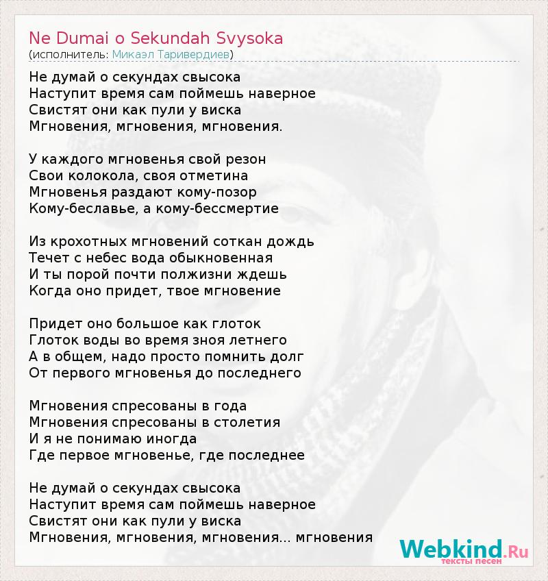 Не думай о секундах свысока Наступит время сам поймешь наверное Свистят они как пули у виска Мгновения, мгновения, мгновения. У каждого мгновенья свой резон Свои колокола, своя отметина Мгновенья раздают кому-позор Кому-беславье, а кому-бессмертие Из крохотных мгновений соткан дождь Течет с небес вода обыкновенная И ты порой почти полжизни ждешь Когда оно придет, твое мгновение Придет оно большое как глоток Глоток воды во время зноя летнего А в общем, надо просто помнить долг От первого мгновенья до последнего Мгновения спресованы в года Мгновения спресованы в столетия И я не понимаю иногда Где первое мгновенье, где последнее Не думай о секундах свысока Наступит время сам поймешь наверное Свистят они как пули у виска Мгновения, мгновения, мгновения... мгновения