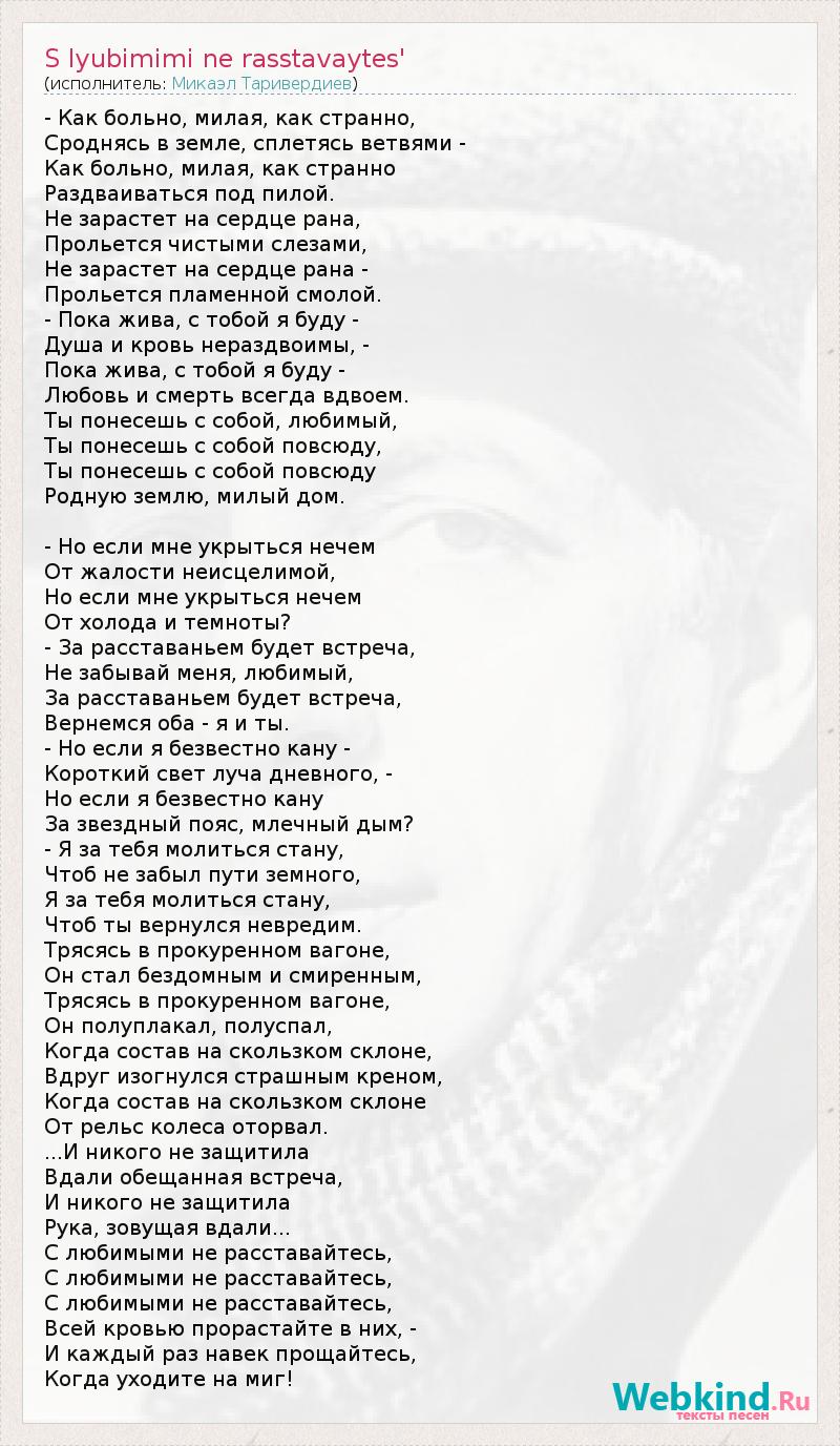 - Как больно, милая, как странно, Сроднясь в земле, сплетясь ветвями - Как больно, милая, как странно Раздваиваться под пилой. Не зарастет на сердце рана, Прольется чистыми слезами, Не зарастет на сердце рана - Прольется пламенной смолой. - Пока жива, с тобой я буду - Душа и кровь нераздвоимы, - Пока жива, с тобой я буду - Любовь и смерть всегда вдвоем. Ты понесешь с собой, любимый, Ты понесешь с собой повсюду, Ты понесешь с собой повсюду Родную землю, милый дом. - Но если мне укрыться нечем От жалости неисцелимой, Но если мне укрыться нечем От холода и темноты? - За расставаньем будет встреча, Не забывай меня, любимый, За расставаньем будет встреча, Вернемся оба - я и ты. - Но если я безвестно кану - Короткий свет луча дневного, - Но если я безвестно кану За звездный пояс, млечный дым? - Я за тебя молиться стану, Чтоб не забыл пути земного, Я за тебя молиться стану, Чтоб ты вернулся невредим. Трясясь в прокуренном вагоне, Он стал бездомным и смиренным, Трясясь в прокуренном вагоне, Он полуплакал, полуспал, Когда состав на скользком склоне, Вдруг изогнулся страшным креном, Когда состав на скользком склоне От рельс колеса оторвал. ...И никого не защитила Вдали обещанная встреча, И никого не защитила Рука, зовущая вдали... С любимыми не расставайтесь, С любимыми не расставайтесь, С любимыми не расставайтесь, Всей кровью прорастайте в них, - И каждый раз навек прощайтесь, Когда уходите на миг!