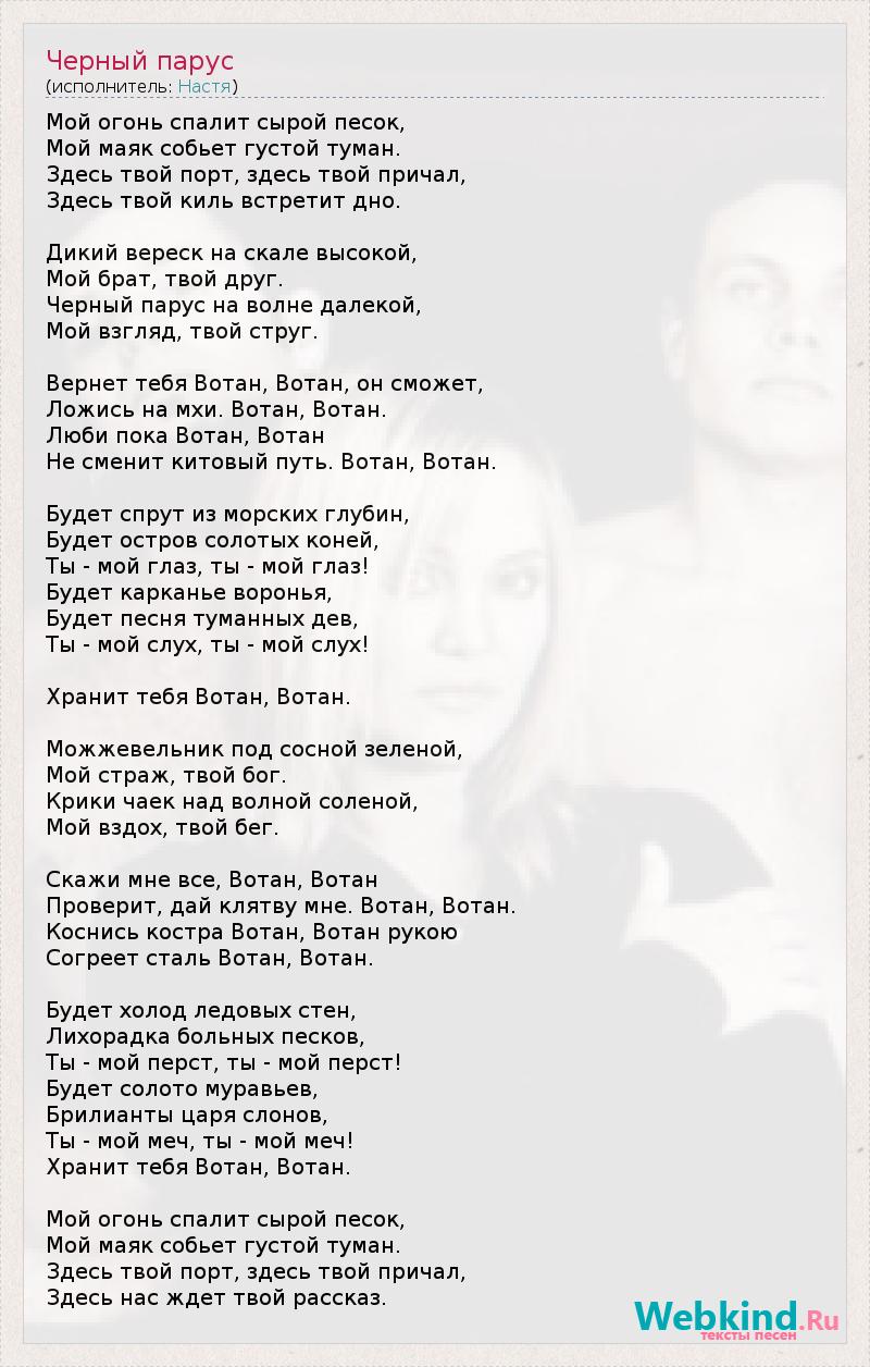 Мой огонь спалит сырой песок, Мой маяк собьет густой туман. Здесь твой порт, здесь твой причал, Здесь твой киль встретит дно. Дикий вереск на скале высокой, Мой брат, твой друг. Черный парус на волне далекой, Мой взгляд, твой струг. Вернет тебя Вотан, Вотан, он сможет, Ложись на мхи. Вотан, Вотан. Люби пока Вотан, Вотан Не сменит китовый путь. Вотан, Вотан. Будет спрут из морских глубин, Будет остров солотых коней, Ты - мой глаз, ты - мой глаз! Будет карканье воронья, Будет песня туманных дев, Ты - мой слух, ты - мой слух! Хранит тебя Вотан, Вотан. Можжевельник под сосной зеленой, Мой страж, твой бог. Крики чаек над волной соленой, Мой вздох, твой бег. Скажи мне все, Вотан, Вотан Проверит, дай клятву мне. Вотан, Вотан. Коснись костра Вотан, Вотан рукою Согреет сталь Вотан, Вотан. Будет холод ледовых стен, Лихорадка больных песков, Ты - мой перст, ты - мой перст! Будет солото муравьев, Брилианты царя слонов, Ты - мой меч, ты - мой меч! Хранит тебя Вотан, Вотан. Мой огонь спалит сырой песок, Мой маяк собьет густой туман. Здесь твой порт, здесь твой причал, Здесь нас ждет твой рассказ.