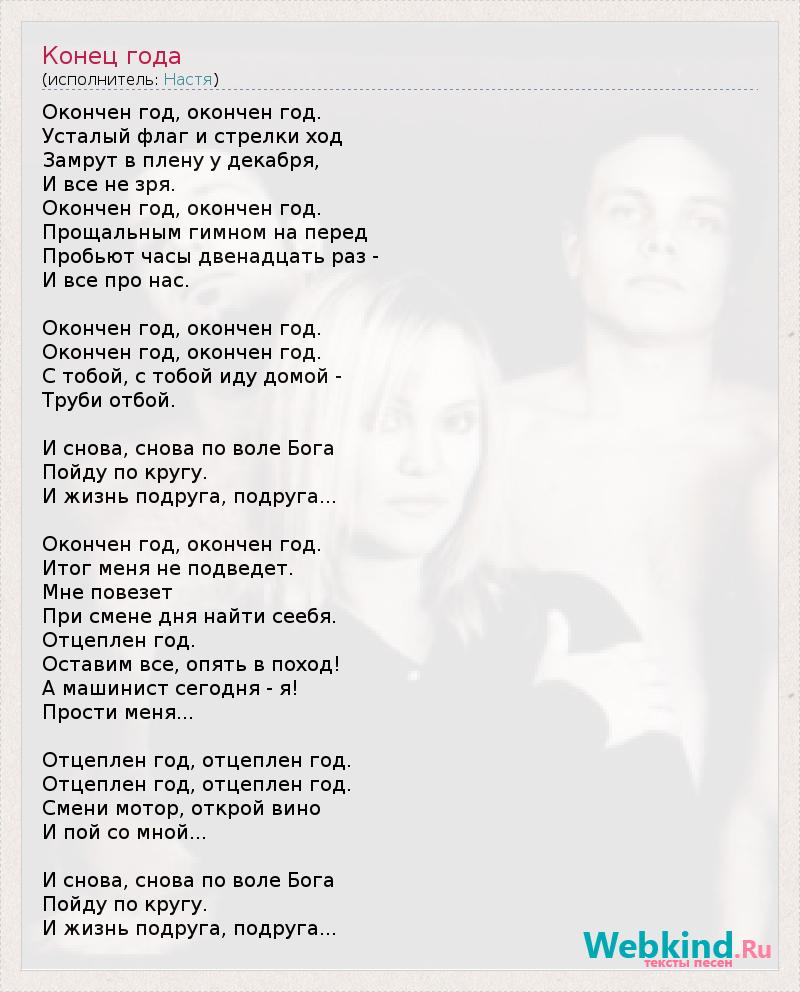 Окончен год, окончен год. Усталый флаг и стрелки ход Замрут в плену у декабря, И все не зря. Окончен год, окончен год. Прощальным гимном на перед Пробьют часы двенадцать раз - И все про нас. Окончен год, окончен год. Окончен год, окончен год. С тобой, с тобой иду домой - Труби отбой. И снова, снова по воле Бога Пойду по кругу. И жизнь подруга, подруга... Окончен год, окончен год. Итог меня не подведет. Мне повезет При смене дня найти сеебя. Отцеплен год. Оставим все, опять в поход! А машинист сегодня - я! Прости меня... Отцеплен год, отцеплен год. Отцеплен год, отцеплен год. Смени мотор, открой вино И пой со мной... И снова, снова по воле Бога Пойду по кругу. И жизнь подруга, подруга...