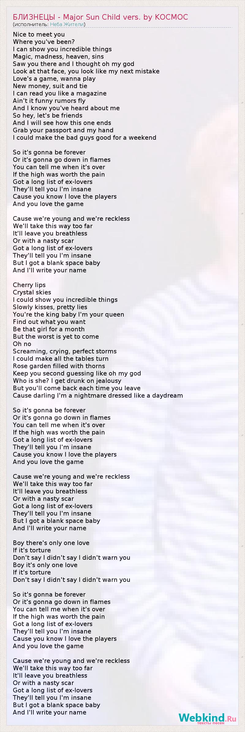 Приятно познакомиться! Где же ты был? Я могу показать тебе невероятные вещи: Магию, безумие, рай, грехи. Я увидела тебя и подумала: "О Боже, Взгляните на это лицо! Ты выглядишь, как моя следующая ошибка!" Любовь - игра, так хочешь сыграть? Новая прибыль, костюм с галстуком. Я читаю тебя как журнал. Разве не забавно, насколько быстро разлетаются слухи? Я знаю, что ты обо мне слышал, Так что, эй, давай останемся друзьями И посмотрим, чем всё закончится. Возьми свой паспорт и мою руку, Я могу плохого мальчика на выходные сделать хорошим. Это будет длиться вечно Или закончится крахом. Скажи мне, если всё кончено, И стоила ли игра свеч. 1 У меня длинный список бывших, Они скажут тебе, что я сумасшедшая, Потому что, знаешь, мне нравятся игроки, А ты любишь играть. Мы молоды и безрассудны, И зайдём слишком далеко. От этого у тебя либо захватит дух, Либо после - останется ужасный шрам. У меня длинный список бывших, Они скажут тебе, что я сумасшедшая. Но в этом списке ещё есть свободное место, И я впишу туда твоё имя. Вишнёвые губы, Хрустальные небеса. Я могу показать тебе невероятные вещи: Неторопливые поцелуи, милую ложь. Ты король, малыш, а я - твоя королева. Я узнаю, что тебе нужно, И месяц побуду такой девушкой, Но худшее еще только впереди... О нет, Крики, слёзы, ураган эмоций - Я сделаю так, что мы поменяемся ролями. Розовый сад полон шипов, И ты продолжаешь гадать: "О Боже, Кто она?" Я пьяна от ревности! Но, уйдя, ты всегда будешь возвращаться, Потому что, дорогой, я кошмар в обличье мечты. Это будет длиться вечно Или закончится крахом. Скажи мне, если всё кончено, И стоила ли игра свеч. У меня длинный список бывших, Они скажут тебе, что я сумасшедшая, Потому что, знаешь, мне нравятся игроки, А ты любишь играть. Мы молоды и безрассудны, И зайдём слишком далеко. От этого у тебя либо захватит дух, Либо после - останется ужасный шрам. У меня длинный список бывших, Они скажут тебе, что я сумасшедшая. Но в этом списке ещё есть свободное место, И я впишу туда твоё имя. Милый, любовь только одна, Так что если это напоминает пытку, Не говори, что я тебя не предупреждала. Милый, любовь только одна, Так что если это напоминает пытку, Не говори, что я тебя не предупреждала. Это будет длиться вечно Или закончится крахом. Скажи мне, если всё кончено, И стоила ли игра свеч. У меня длинный список бывших, Они скажут тебе, что я сумасшедшая, Потому что, знаешь, мне нравятся игроки, А ты любишь играть. Мы молоды и безрассудны, И зайдём слишком далеко. От этого у тебя либо захватит дух, Либо после - останется ужасный шрам. У меня длинный список бывших, Они скажут тебе, что я сумасшедшая. Но в этом списке ещё есть свободное место, И я впишу туда твоё имя. 1 - If the high was worth the pain - досл.: "Стоило ли блаженство боли?"