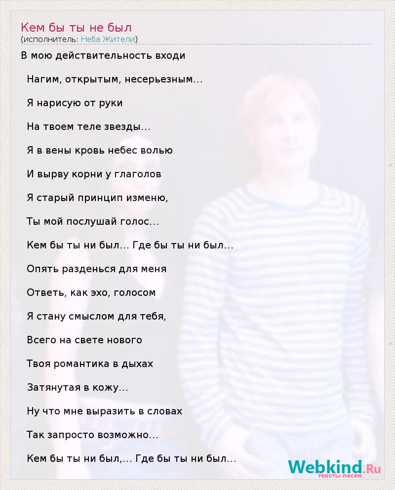 В мою действительность входи Нагим, открытым, несерьезным… Я нарисую от руки На твоем теле звезды… Я в вены кровь небес волью И вырву корни у глаголов Я старый принцип изменю, Ты мой послушай голос… Кем бы ты ни был… Где бы ты ни был… Опять разденься для меня Ответь, как эхо, голосом Я стану смыслом для тебя, Всего на свете нового Твоя романтика в дыхах Затянутая в кожу… Ну что мне выразить в словах Так запросто возможно… Кем бы ты ни был,… Где бы ты ни был…