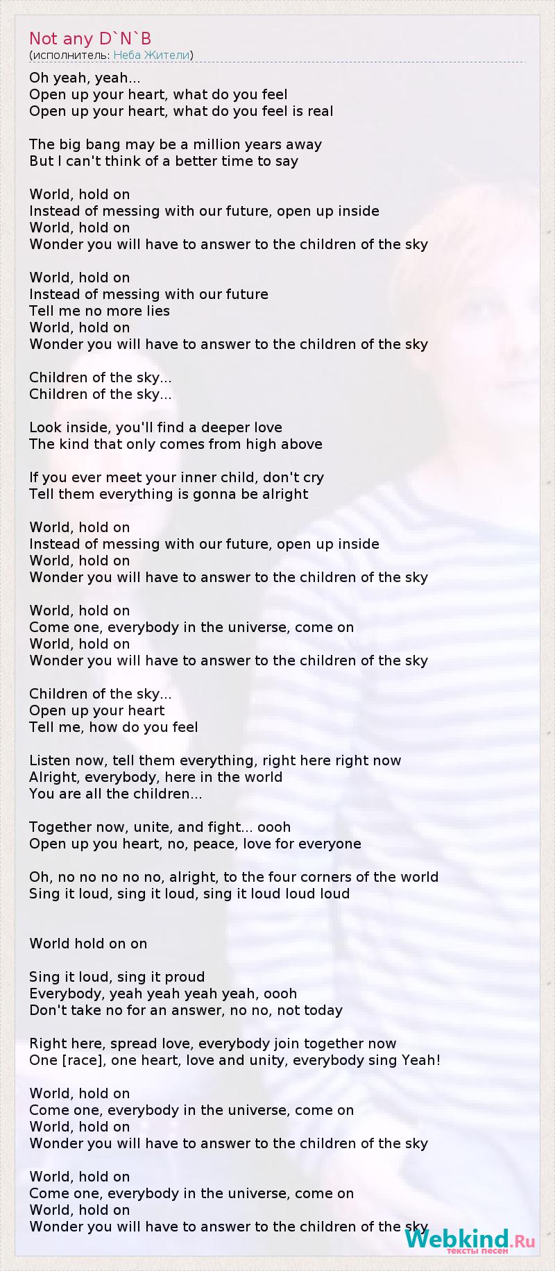Oh yeah, yeah... Open up your heart, what do you feel Open up your heart, what do you feel is real The big bang may be a million years away But I can't think of a better time to say World, hold on Instead of messing with our future, open up inside World, hold on Wonder you will have to answer to the children of the sky World, hold on Instead of messing with our future Tell me no more lies World, hold on Wonder you will have to answer to the children of the sky Children of the sky... Children of the sky... Look inside, you'll find a deeper love The kind that only comes from high above If you ever meet your inner child, don't cry Tell them everything is gonna be alright World, hold on Instead of messing with our future, open up inside World, hold on Wonder you will have to answer to the children of the sky World, hold on Come one, everybody in the universe, come on World, hold on Wonder you will have to answer to the children of the sky Children of the sky... Open up your heart Tell me, how do you feel Listen now, tell them everything, right here right now Alright, everybody, here in the world You are all the children... Together now, unite, and fight... oooh Open up you heart, no, peace, love for everyone Oh, no no no no no, alright, to the four corners of the world Sing it loud, sing it loud, sing it loud loud loud World hold on on Sing it loud, sing it proud Everybody, yeah yeah yeah yeah, oooh Don't take no for an answer, no no, not today Right here, spread love, everybody join together now One [race], one heart, love and unity, everybody sing Yeah! World, hold on Come one, everybody in the universe, come on World, hold on Wonder you will have to answer to the children of the sky World, hold on Come one, everybody in the universe, come on World, hold on Wonder you will have to answer to the children of the sky