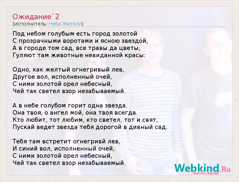 Под небом голубым есть город золотой С прозрачными воротами и ясною звездой, А в городе том сад, все травы да цветы, Гуляют там животные невиданной красы: Одно, как желтый огнегривый лев, Другое вол, исполненный очей, С ними золотой орел небесный, Чей так светел взор незабываемый. А в небе голубом горит одна звезда. Она твоя, о ангел мой, она твоя всегда. Кто любит, тот любим, кто светел, тот и свят, Пускай ведет звезда тебя дорогой в дивный сад. Тебя там встретит огнегривй лев, И синий вол, исполненный очей, С ними золотой орел небесный, Чей так светел взор незабываемый.