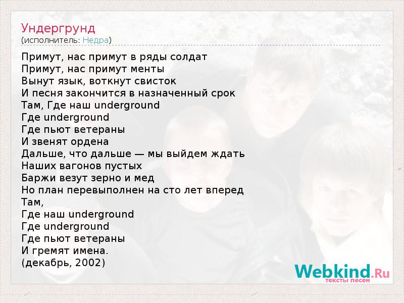 Примут, нас примут в ряды солдат Примут, нас примут менты Вынут язык, воткнут свисток И песня закончится в назначенный срок Там, Где наш underground Где underground Где пьют ветераны И звенят ордена Дальше, что дальше — мы выйдем ждать Наших вагонов пустых Баржи везут зерно и мед Но план перевыполнен на сто лет вперед Там, Где наш underground Где underground Где пьют ветераны И гремят имена. (декабрь, 2002)