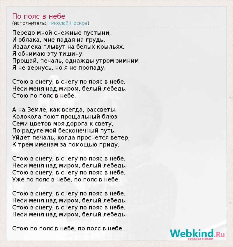 Передо мной снежные пустыни, И облака, мне падая на грудь, Издалека плывут на белых крыльях. Я обнимаю эту тишину. Прощай, печаль, однажды утром зимним Я не вернусь, но я не пропаду. Стою в снегу, в снегу по пояс в небе. Неси меня над миром, белый лебедь. Стою по пояс в небе. А на Земле, как всегда, рассветы. Колокола поют прощальный блюз. Семи цветов моя дорога к свету, По радуге мой бесконечный путь. Уйдет печаль, когда проснется ветер, К трем именам за помощью приду. Стою в снегу, в снегу по пояс в небе. Неси меня над миром, белый лебедь. Стою в снегу, в снегу по пояс в небе. Уже по пояс в небе, по пояс в небе. Стою в снегу, в снегу по пояс в небе. Неси меня над миром, белый лебедь. Стою в снегу, в снегу по пояс в небе. Неси меня над миром, белый лебедь. Стою по пояс в небе, по пояс в небе.
