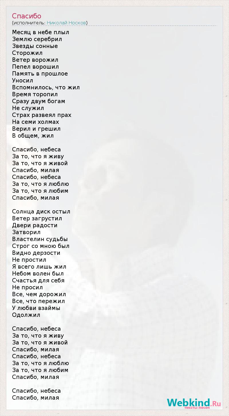 Месяц в небе плыл Землю серебрил Звезды сонные Сторожил Ветер ворожил Пепел ворошил Память в прошлое Уносил Вспомнилось, что жил Время торопил Сразу двум богам Не служил Страх развеял прах На семи холмах Верил и грешил В общем, жил Спасибо, небеса За то, что я живу За то, что я живой Спасибо, милая Спасибо, небеса За то, что я люблю За то, что я любим Спасибо, милая Солнца диск остыл Ветер загрустил Двери радости Затворил Властелин судьбы Строг со мною был Видно дерзости Не простил Я всего лишь жил Небом волен был Счастья для себя Не просил Все, чем дорожил Все, что пережил У любви взаймы Одолжил Спасибо, небеса За то, что я живу За то, что я живой Спасибо, милая Спасибо, небеса За то, что я люблю За то, что я любим Спасибо, милая Спасибо, небеса Спасибо, милая