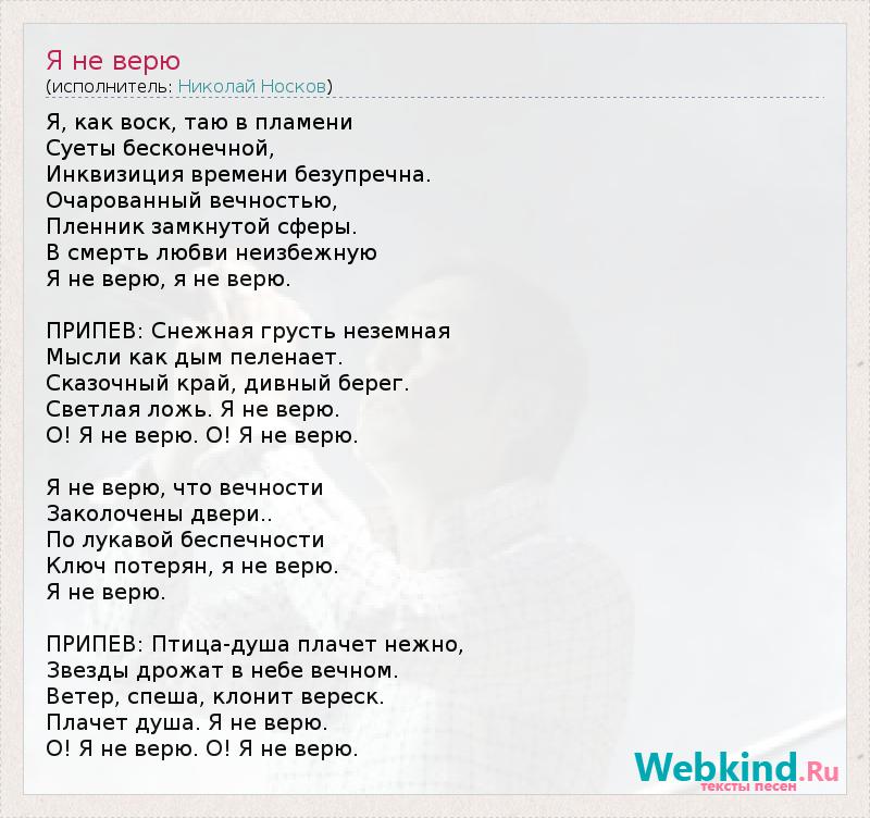 Я, как воск, таю в пламени Суеты бесконечной, Инквизиция времени безупречна. Очарованный вечностью, Пленник замкнутой сферы. В смерть любви неизбежную Я не верю, я не верю. ПРИПЕВ: Снежная грусть неземная Мысли как дым пеленает. Сказочный край, дивный берег. Светлая ложь. Я не верю. О! Я не верю. О! Я не верю. Я не верю, что вечности Заколочены двери.. По лукавой беспечности Ключ потерян, я не верю. Я не верю. ПРИПЕВ: Птица-душа плачет нежно, Звезды дрожат в небе вечном. Ветер, спеша, клонит вереск. Плачет душа. Я не верю. О! Я не верю. О! Я не верю.