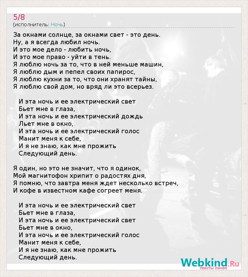 За окнами солнце, за окнами свет - это день. Ну, а я всегда любил ночь. И это мое дело - любить ночь, И это мое право - уйти в тень. Я люблю ночь за то, что в ней меньше машин, Я люблю дым и пепел своих папирос, Я люблю кухни за то, что они хранят тайны, Я люблю свой дом, но вряд ли это всерьез. И эта ночь и ее электрический свет Бьет мне в глаза, И эта ночь и ее электрический дождь Льет мне в окно, И эта ночь и ее электрический голос Манит меня к себе, И я не знаю, как мне прожить Следующий день. Я один, но это не значит, что я одинок, Мой магнитофон хрипит о радостях дня, Я помню, что завтра меня ждет несколько встреч, И кофе в известном кафе согреет меня. И эта ночь и ее электрический свет Бьет мне в глаза, И эта ночь и ее электрический свет Бьет мне в окно, И эта ночь и ее электрический голос Манит меня к себе, И я не знаю, как мне прожить Следующий день.