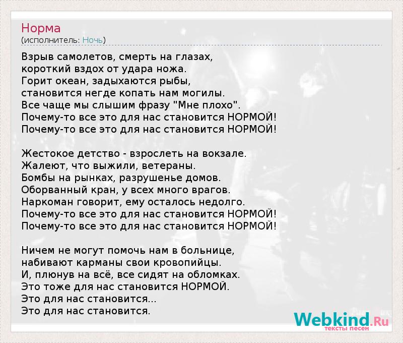 Взрыв самолетов, смерть на глазах, короткий вздох от удара ножа. Горит океан, задыхаются рыбы, становится негде копать нам могилы. Все чаще мы слышим фразу "Мне плохо". Почему-то все это для нас становится НОРМОЙ! Почему-то все это для нас становится НОРМОЙ! Жестокое детство - взрослеть на вокзале. Жалеют, что выжили, ветераны. Бомбы на рынках, разрушенье домов. Оборванный кран, у всех много врагов. Наркоман говорит, ему осталось недолго. Почему-то все это для нас становится НОРМОЙ! Почему-то все это для нас становится НОРМОЙ! Ничем не могут помочь нам в больнице, набивают карманы свои кровопийцы. И, плюнув на всё, все сидят на обломках. Это тоже для нас становится НОРМОЙ. Это для нас становится... Это для нас становится.