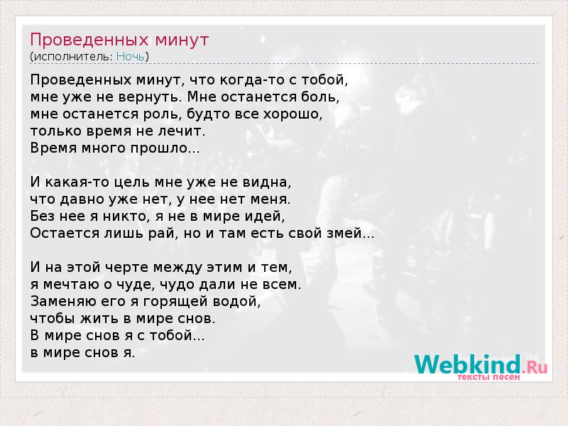 Проведенных минут, что когда-то с тобой, мне уже не вернуть. Мне останется боль, мне останется роль, будто все хорошо, только время не лечит. Время много прошло... И какая-то цель мне уже не видна, что давно уже нет, у нее нет меня. Без нее я никто, я не в мире идей, Остается лишь рай, но и там есть свой змей... И на этой черте между этим и тем, я мечтаю о чуде, чудо дали не всем. Заменяю его я горящей водой, чтобы жить в мире снов. В мире снов я с тобой... в мире снов я.