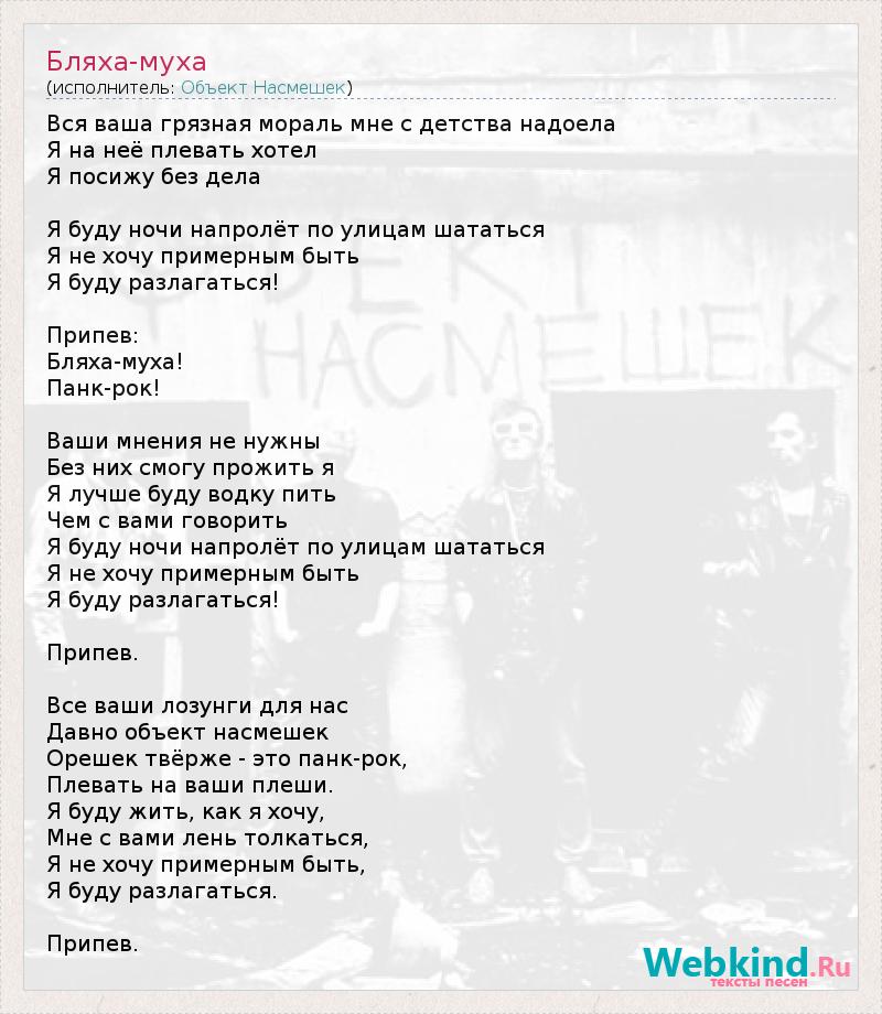 Вся ваша грязная мораль мне с детства надоела Я на неё плевать хотел Я посижу без дела Я буду ночи напролёт по улицам шататься Я не хочу примерным быть Я буду разлагаться! Припев: Бляха-муха! Панк-рок! Ваши мнения не нужны Без них смогу прожить я Я лучше буду водку пить Чем с вами говорить Я буду ночи напролёт по улицам шататься Я не хочу примерным быть Я буду разлагаться! Припев. Все ваши лозунги для нас Давно объект насмешек Орешек твёрже - это панк-рок, Плевать на ваши плеши. Я буду жить, как я хочу, Мне с вами лень толкаться, Я не хочу примерным быть, Я буду разлагаться. Припев.